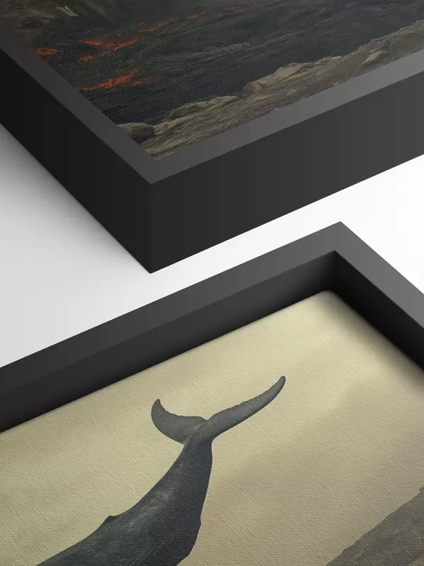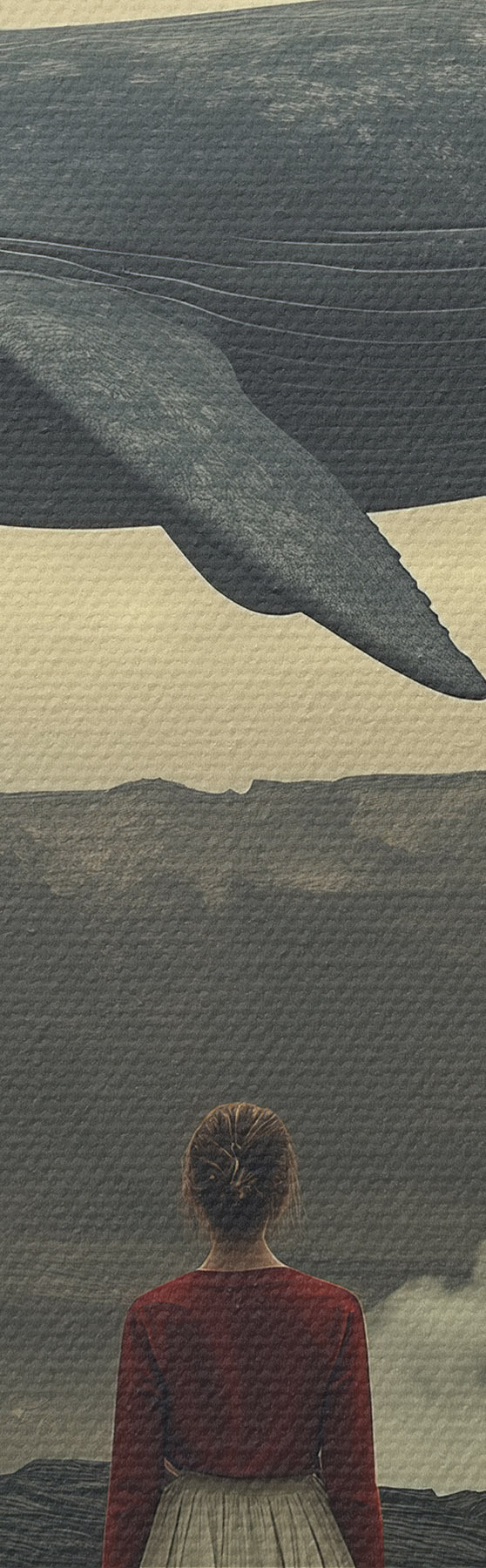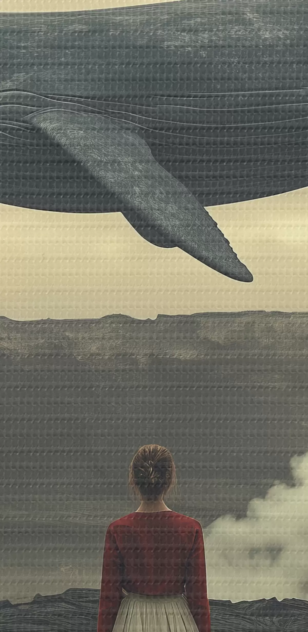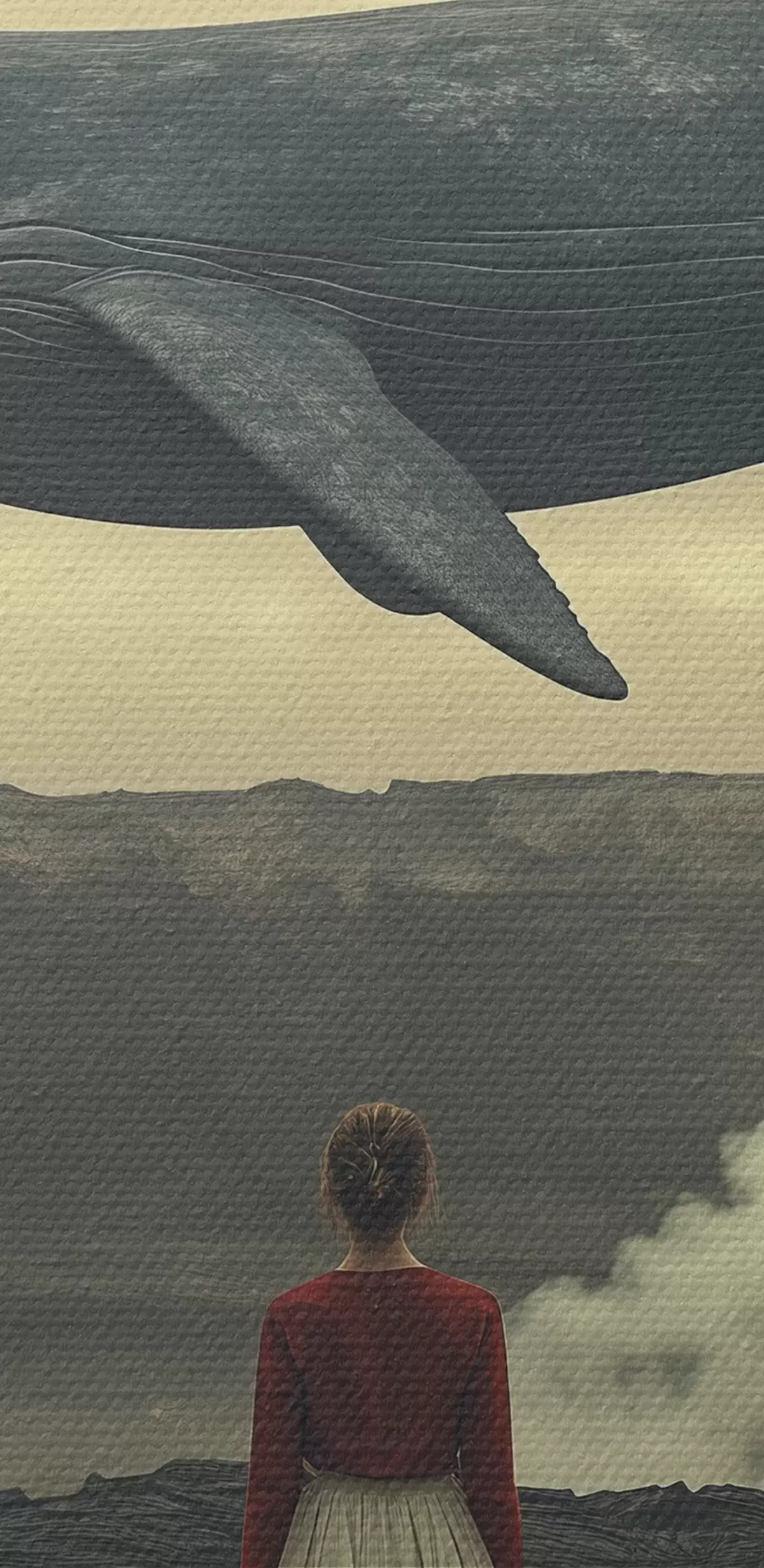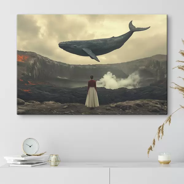 Glezna Meitene uz lavas ar lielu lidojošu vaļu debesīs s40986
