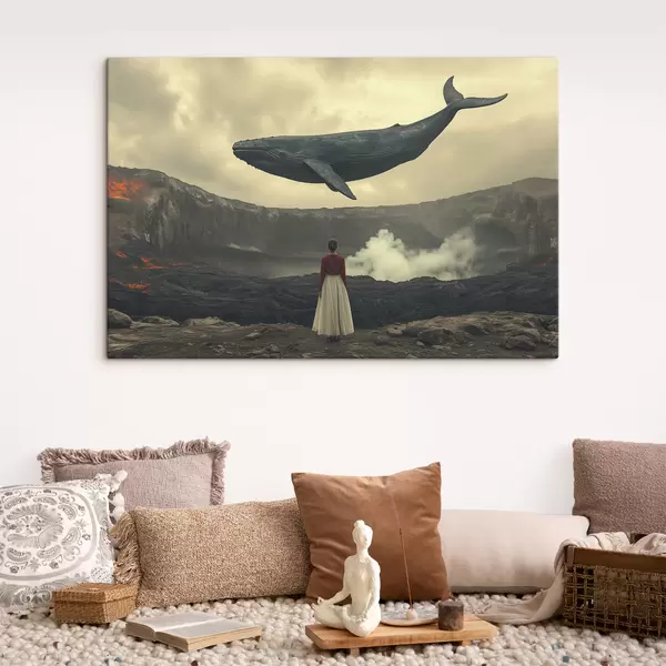 Glezna Meitene uz lavas ar lielu lidojošu vaļu debesīs s40986
