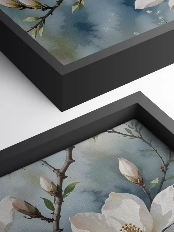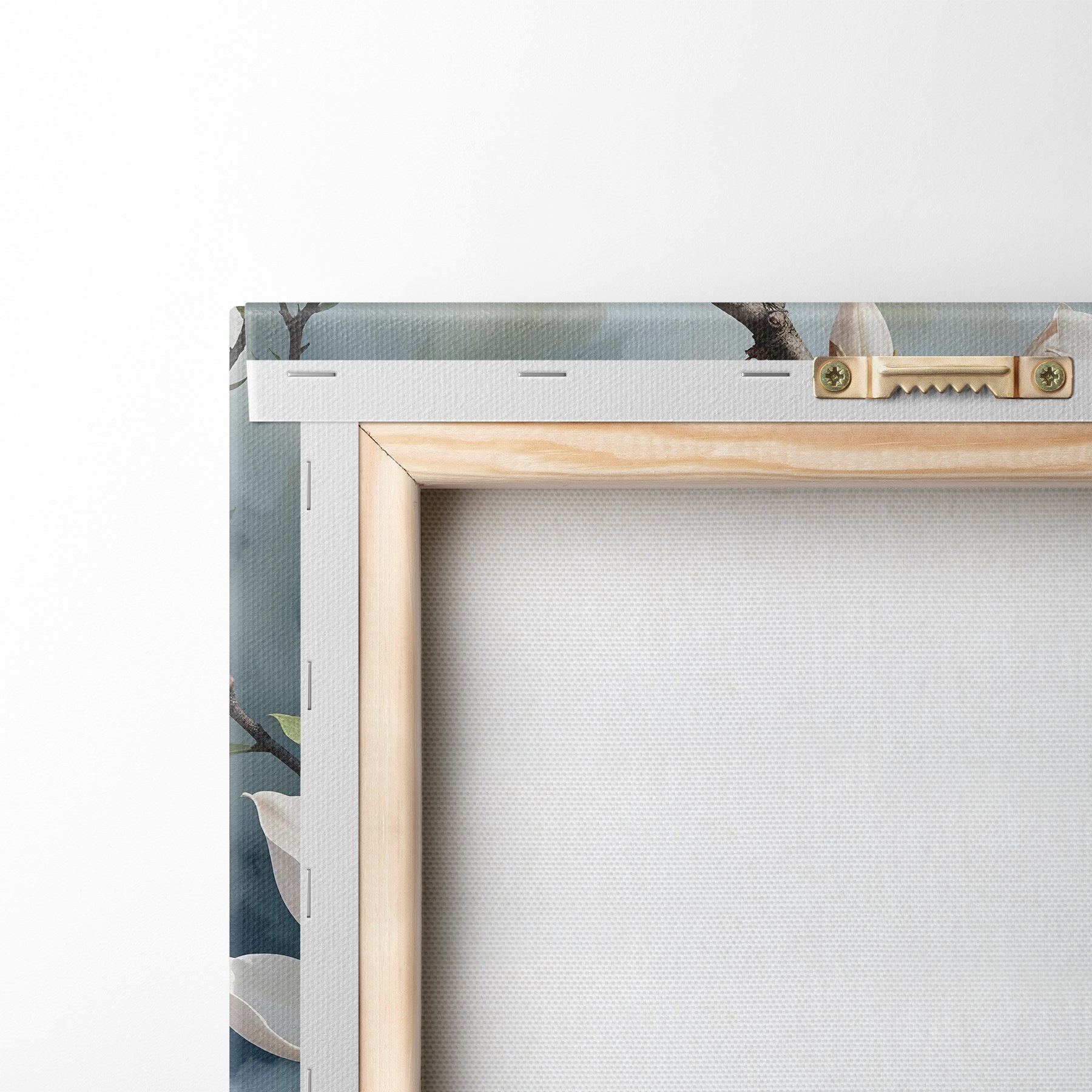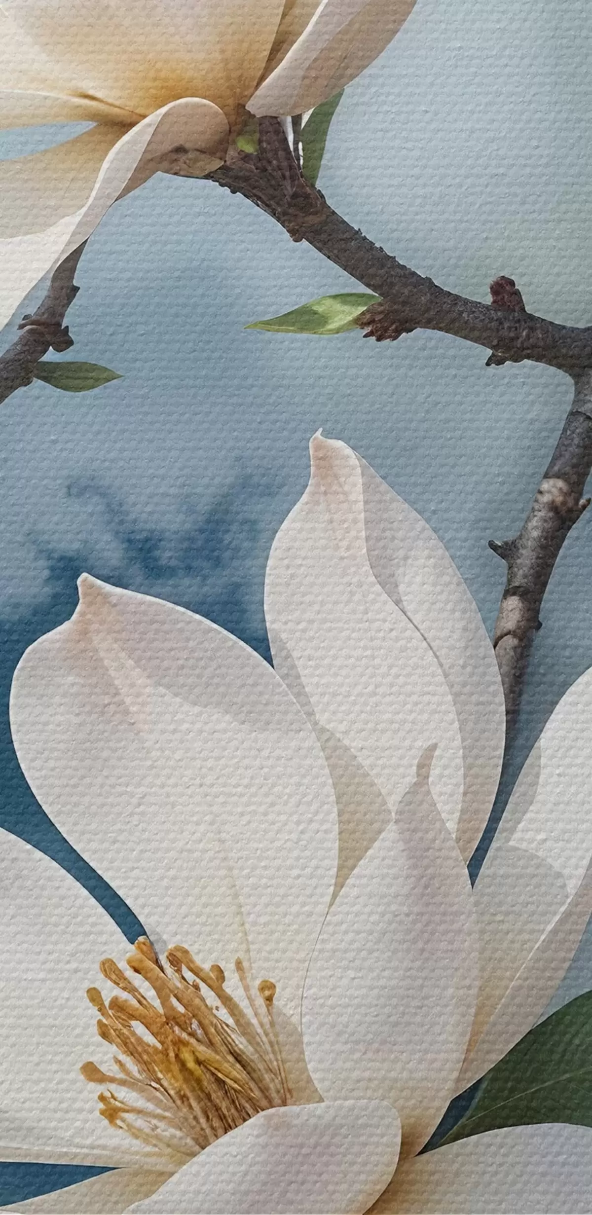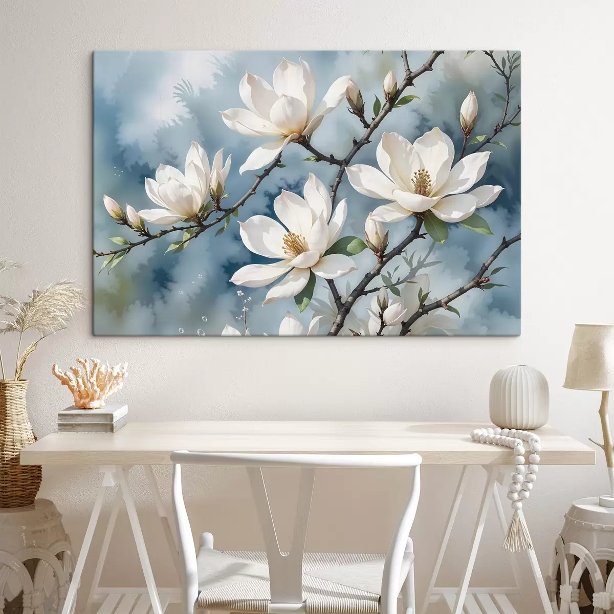 Glezna Balti magnolijas ziedi uz koku zariem uz mīksta akvareļkrāsas zila debesu fona s41081