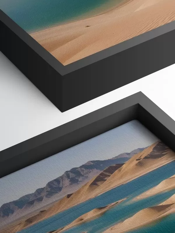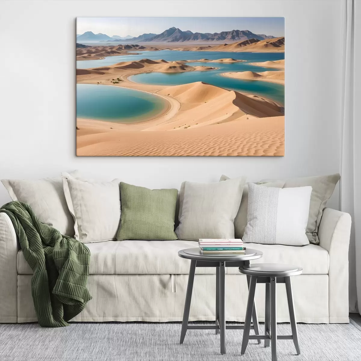 Glezna Plaša tuksneša ainava ar smilšu kāpām un tirkīza ezeriem, ko ieskauj nelīdzeni kalni Nr s41087