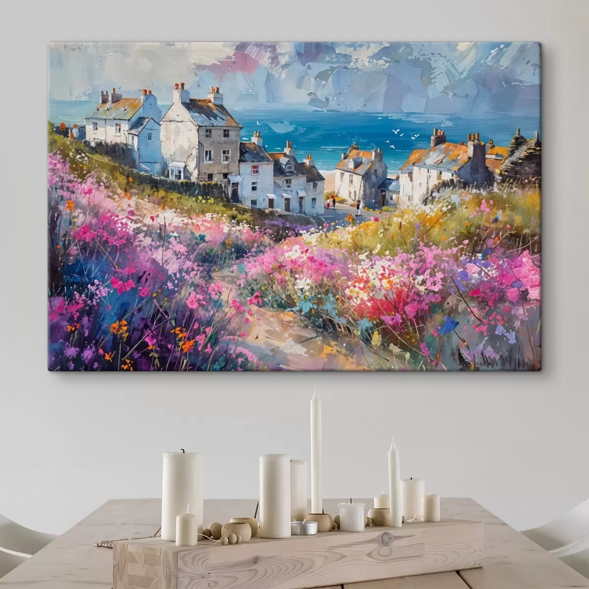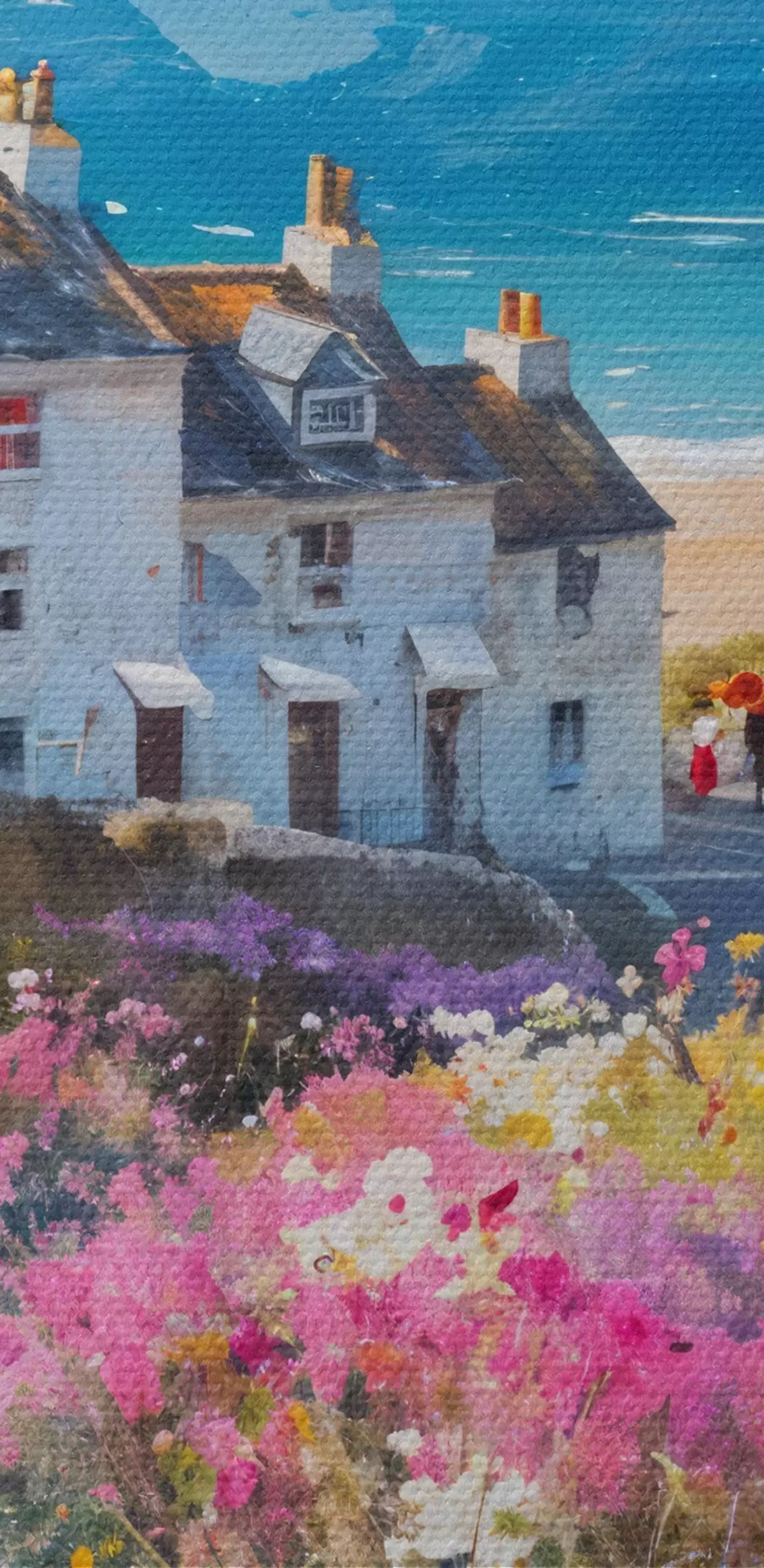 Glezna Krāsaina eļļas glezna piekrastes pilsēta ar baltām mājām un košu puķu dārzu priekšplānā s41090