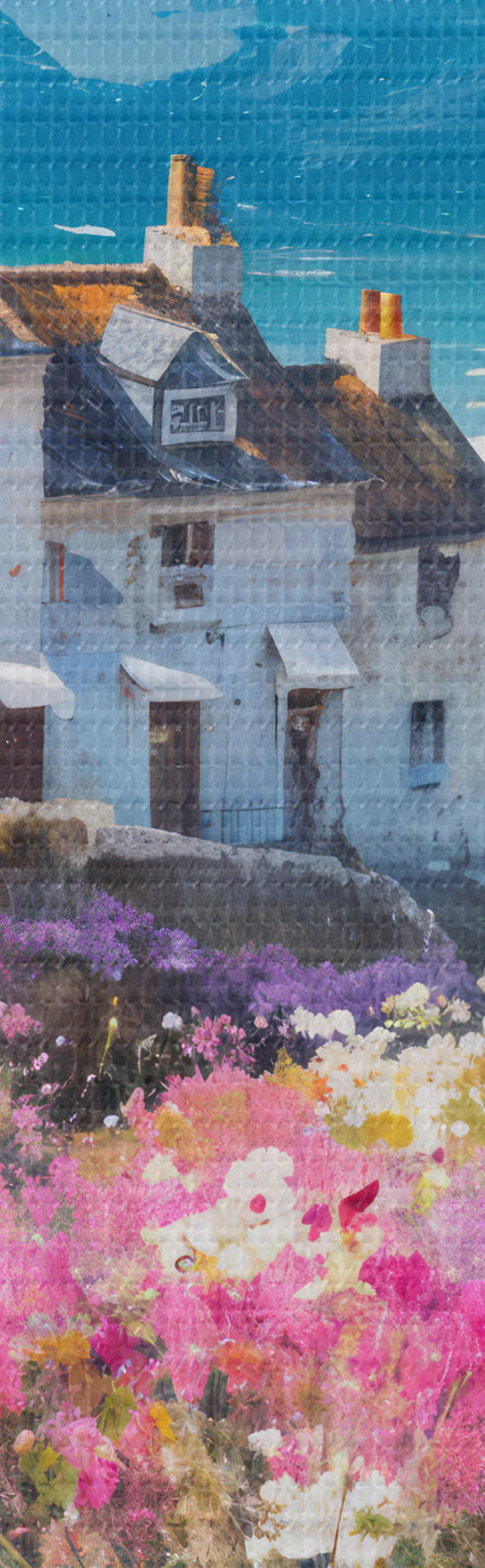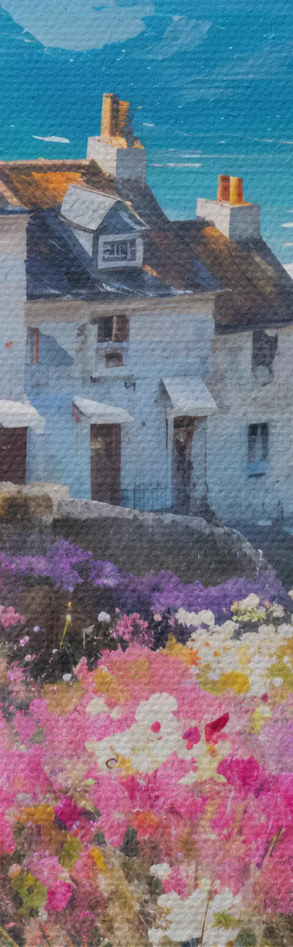 Glezna Krāsaina eļļas glezna piekrastes pilsēta ar baltām mājām un košu puķu dārzu priekšplānā Nr s41090