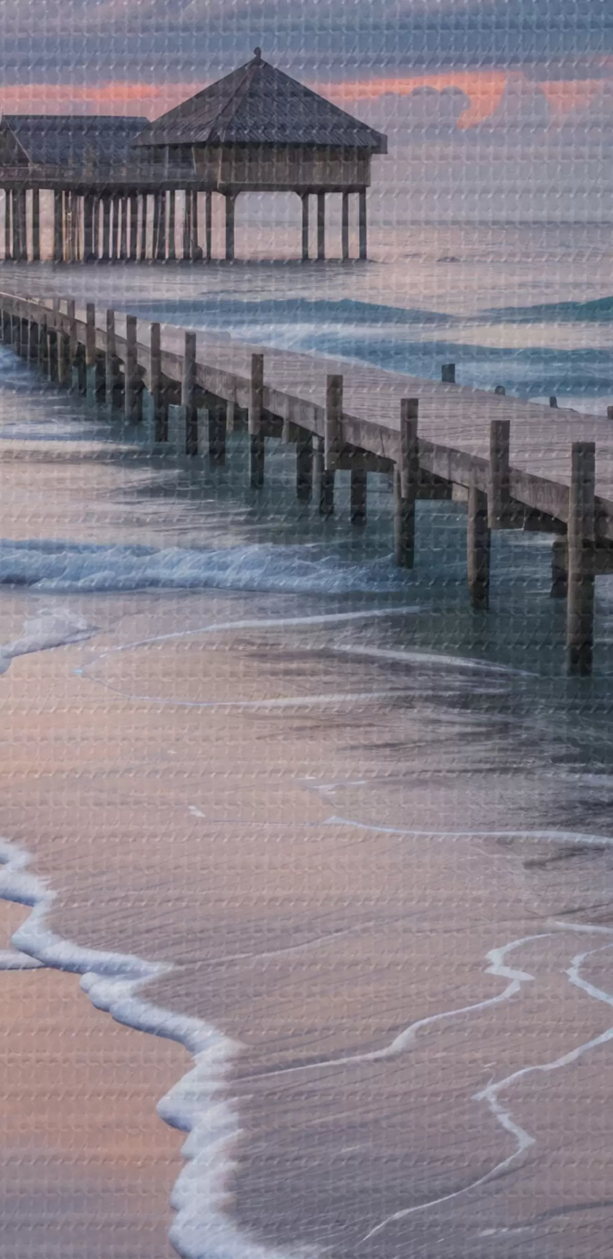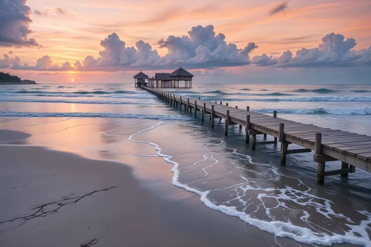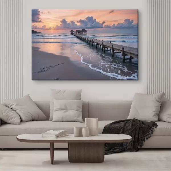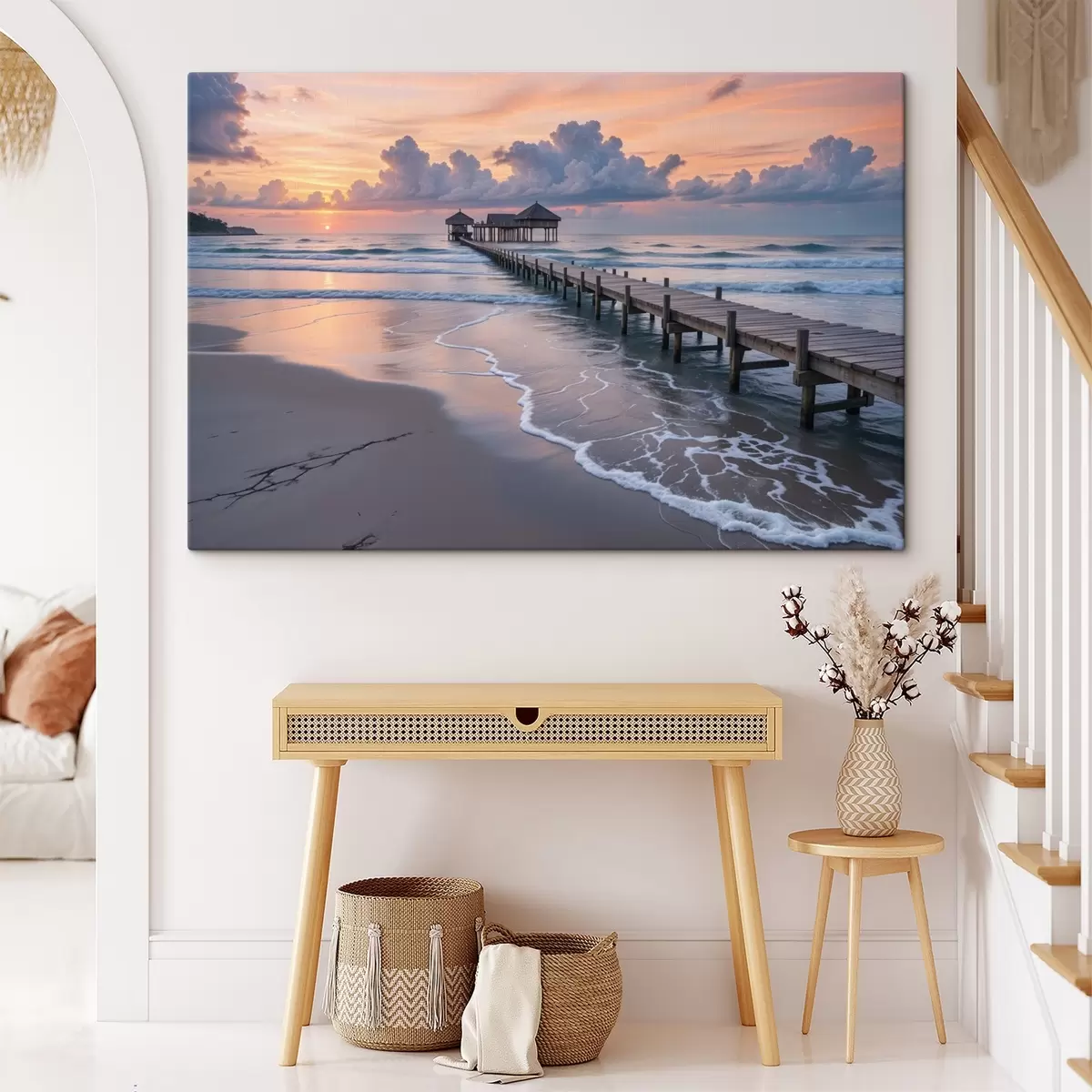 Glezna Koka mols, kas saulrieta saulrietā iestiepjas mierīgā okeānā ar krāsainiem mākoņiem  s41091