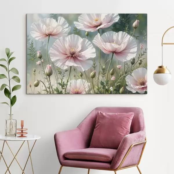 Glezna Delikātu, gaiši rozā magoņu ziedu lauks ar maigiem, izplūdušiem ziedlapiņām uz izplūduša zaļa fona Nr s41094