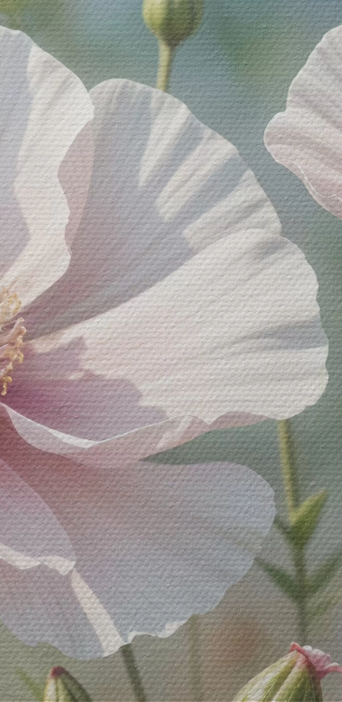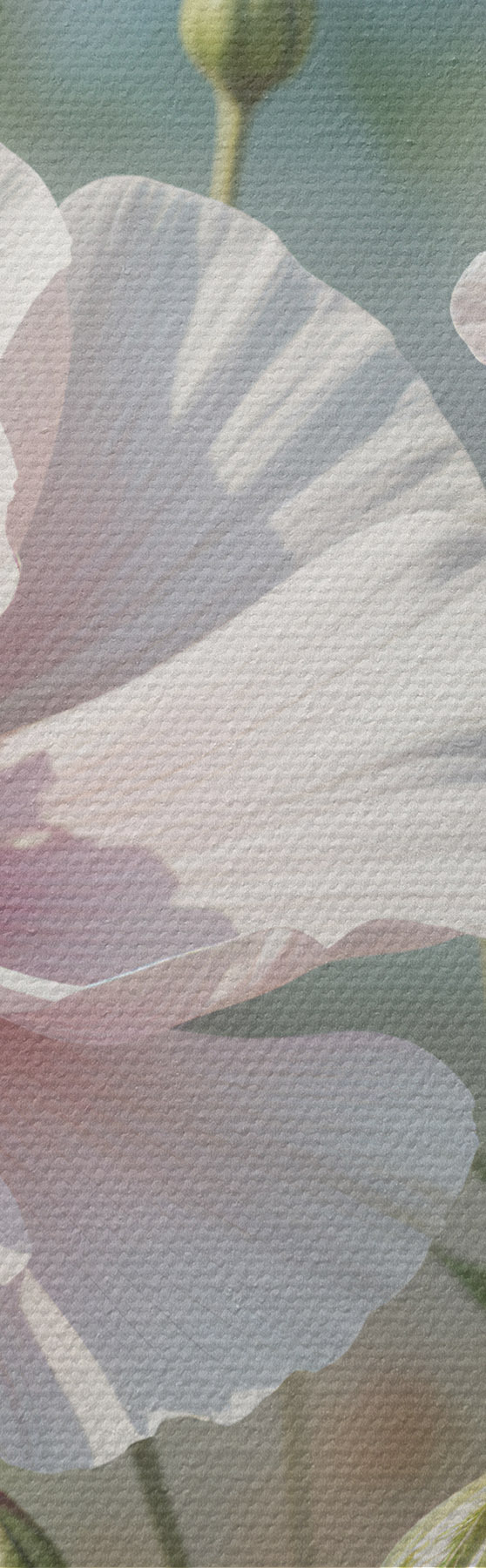 Glezna Delikātu, gaiši rozā magoņu ziedu lauks ar maigiem, izplūdušiem ziedlapiņām uz izplūduša zaļa fona s41094