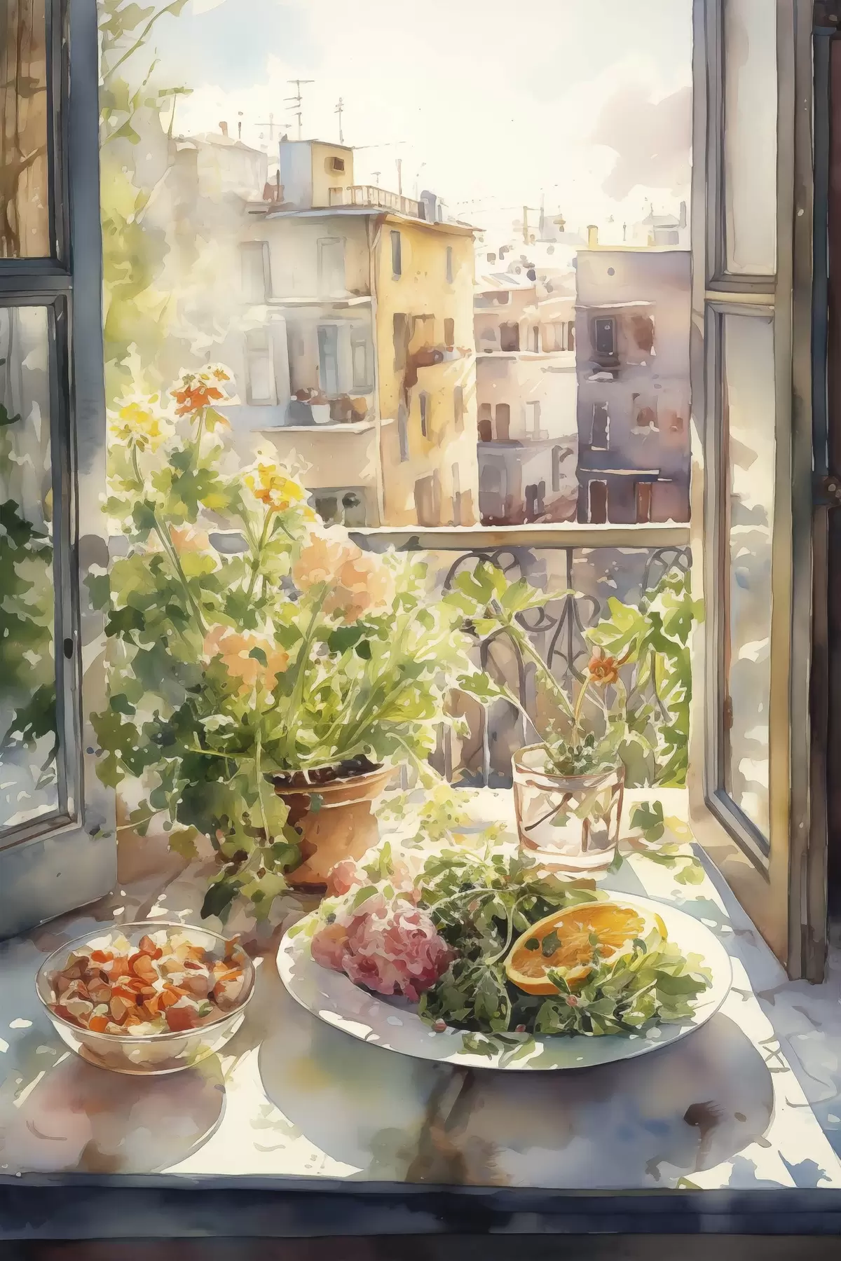 Glezna Akvareļu vakariņas, pilsētas skats, ziedi, daba, zaļie salāti Nr s41166