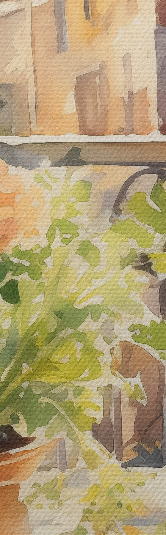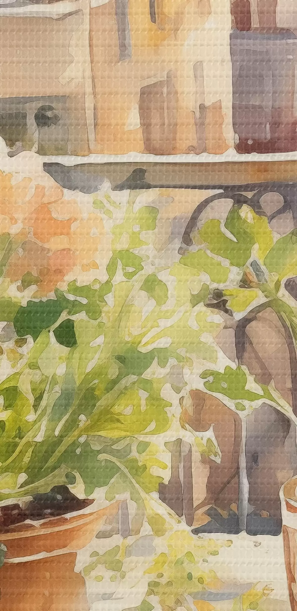 Glezna Akvareļu vakariņas, pilsētas skats, ziedi, daba, zaļie salāti s41166