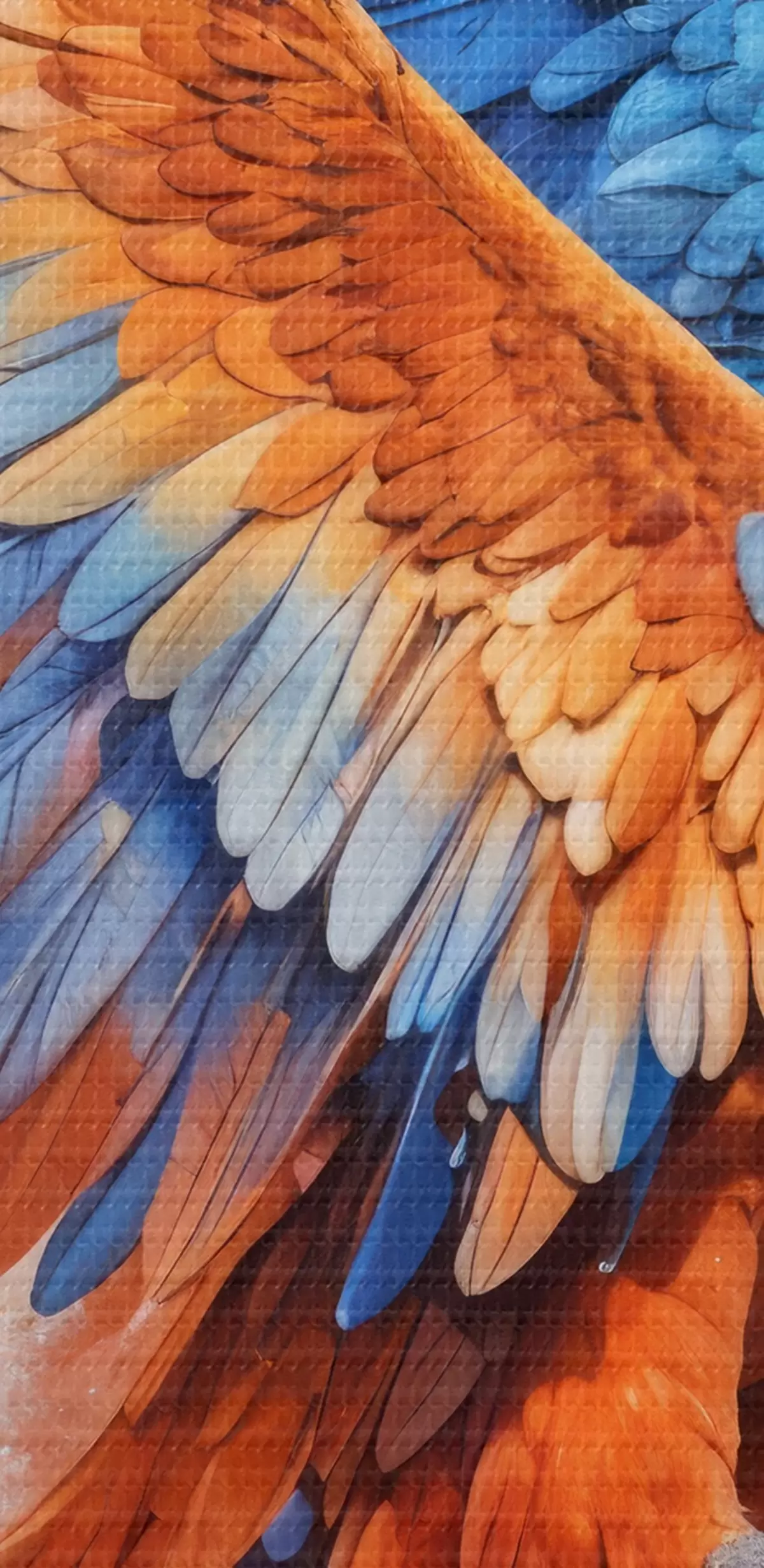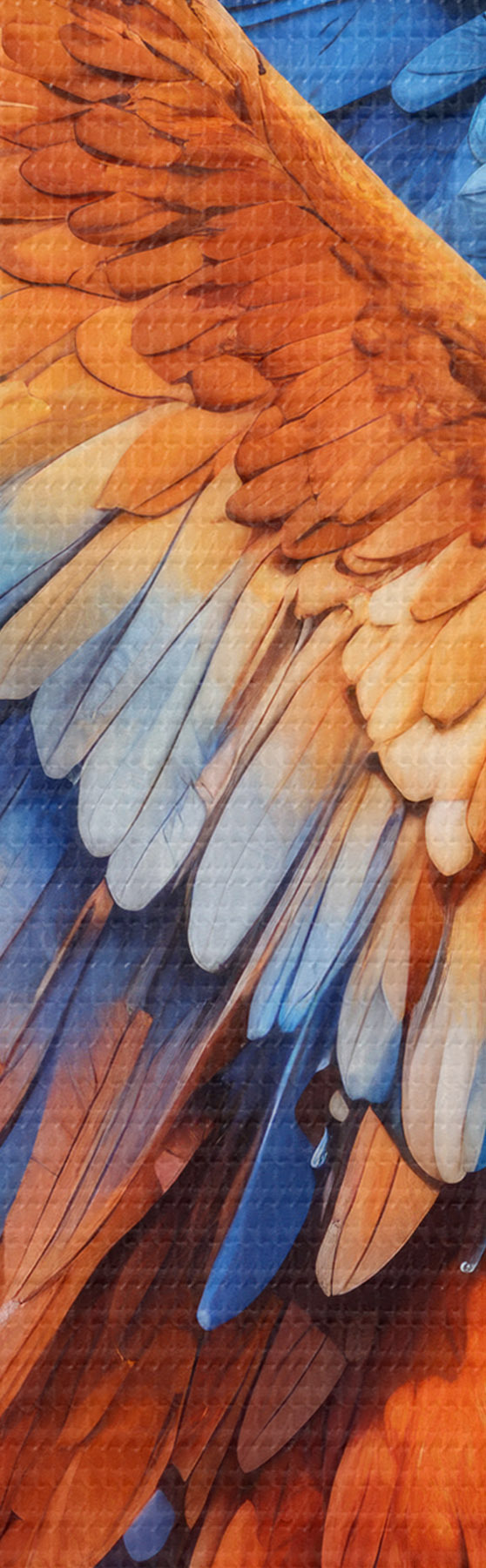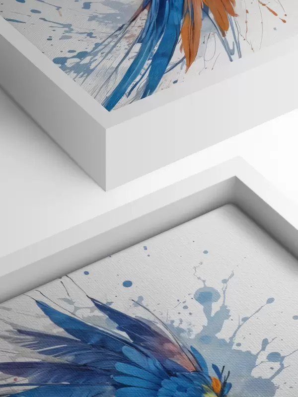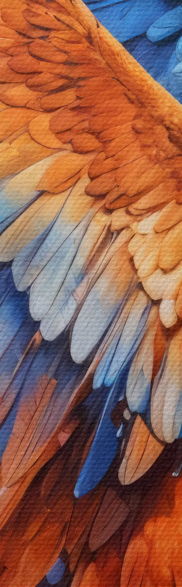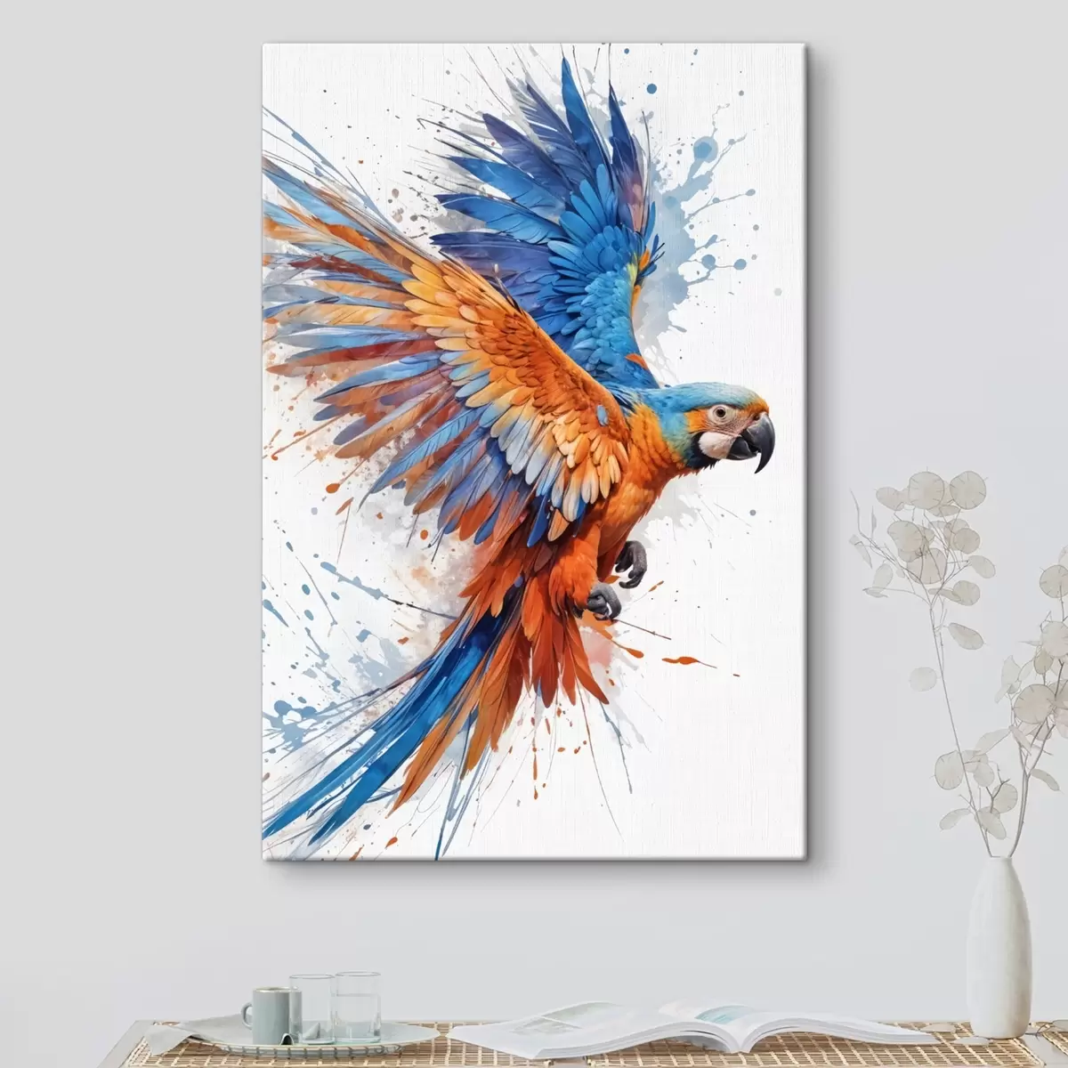 Glezna Krāsains papagailis ar koši zilām, oranžām un dzeltenām spalvām lidojumā uz izplūduša fona s41250