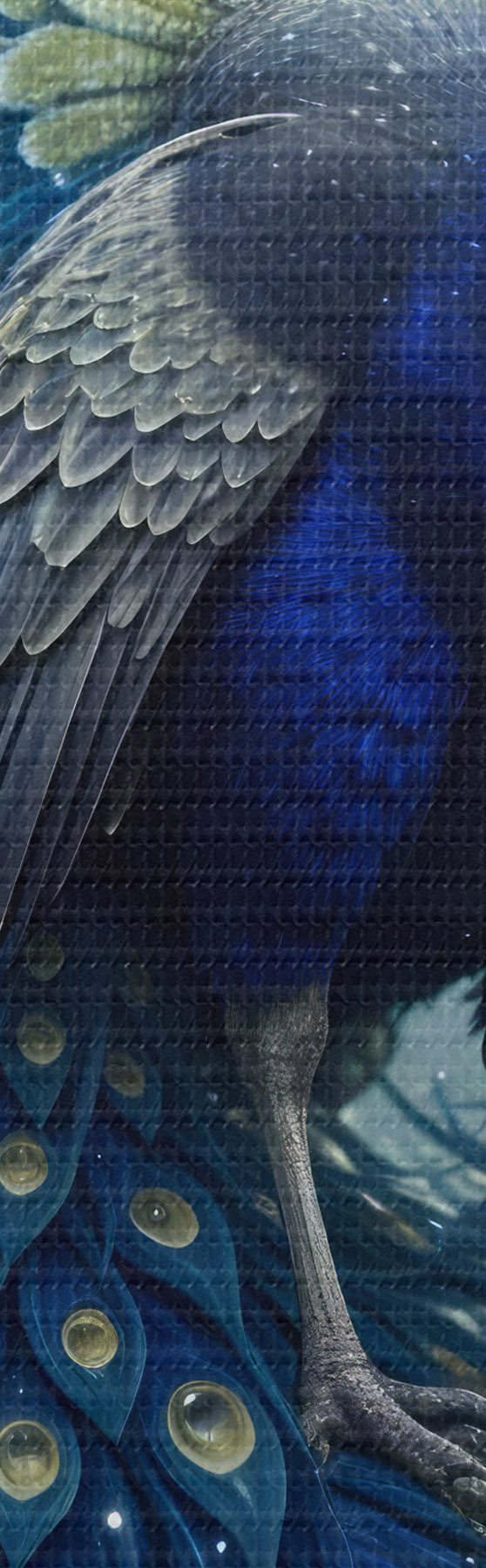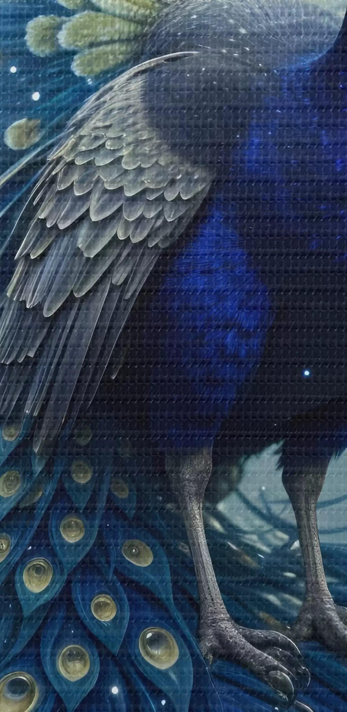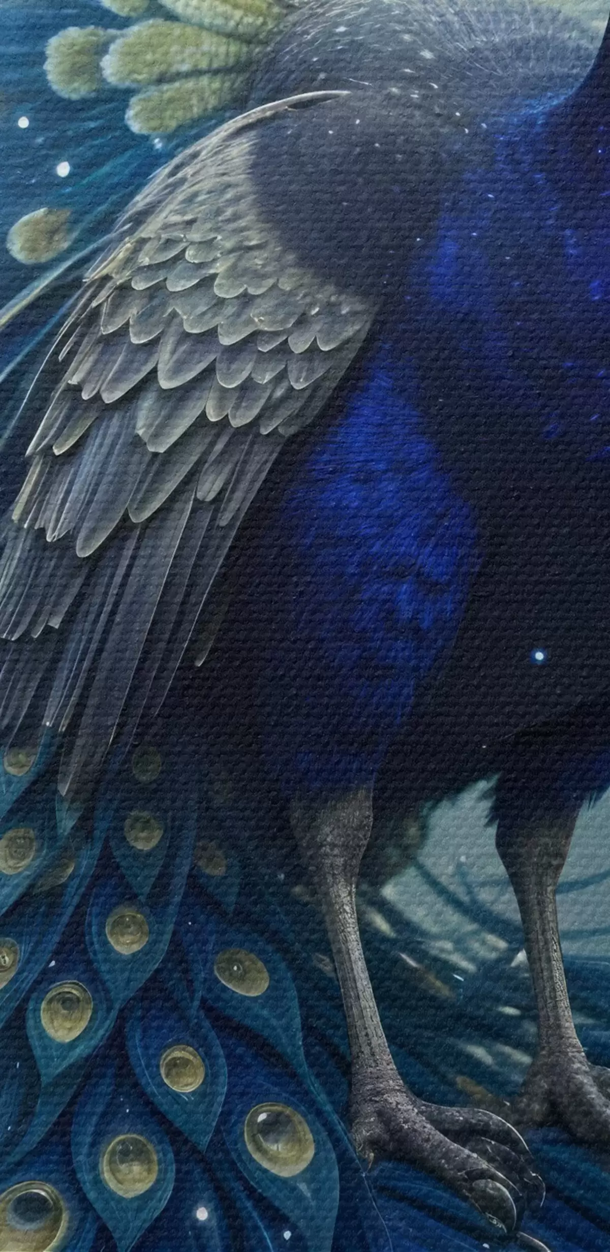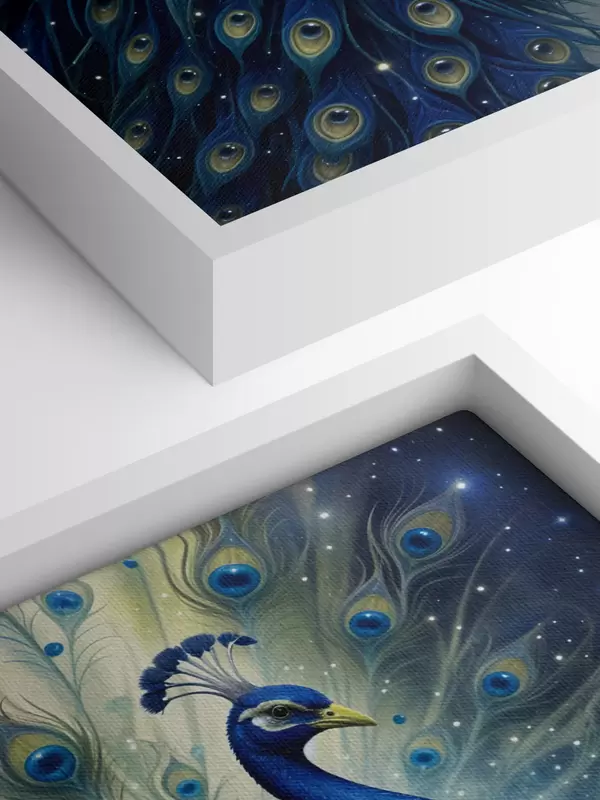 Glezna Spilgts un majestātisks pāvs uz zvaigžņotas nakts debess fona, kas rada maģisku un ēterisku atmosfēru s41256