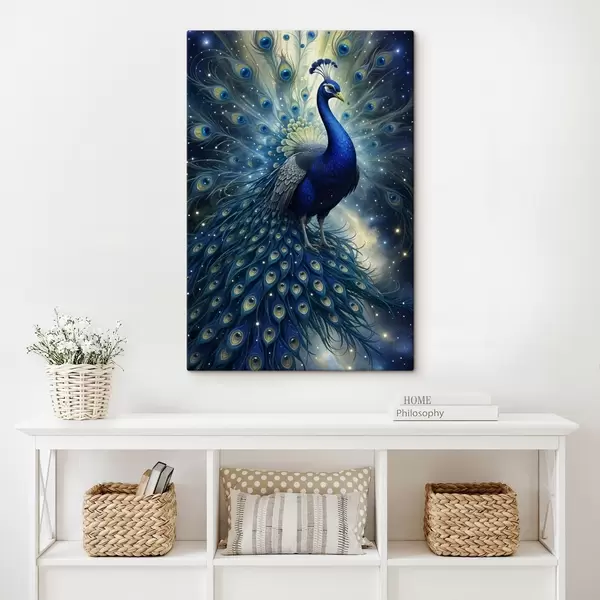 Glezna Spilgts un majestātisks pāvs uz zvaigžņotas nakts debess fona, kas rada maģisku un ēterisku atmosfēru Nr s41256