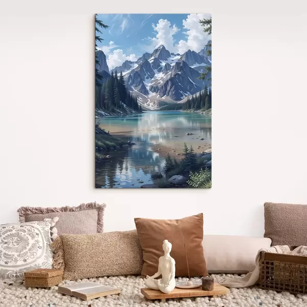 Glezna Rāms Alpu ezers, ko ieskauj majestātiski sniegotie kalni, ar blīvu mežu un mākoņainām debesīm Nr s41264