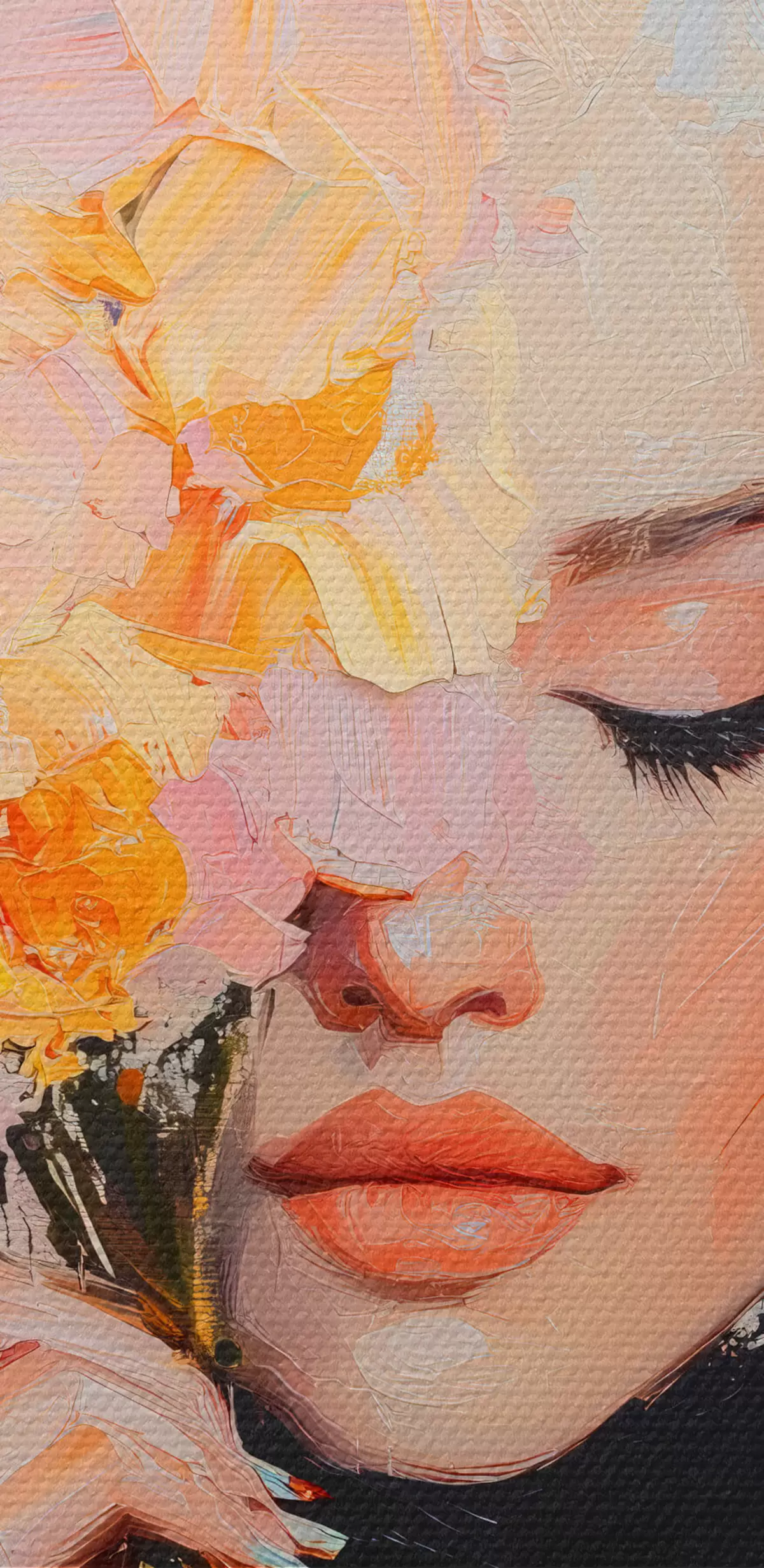 Glezna Abstrakta sieviete ar ziedu pušķi rokās ar otas triepieniem s41355