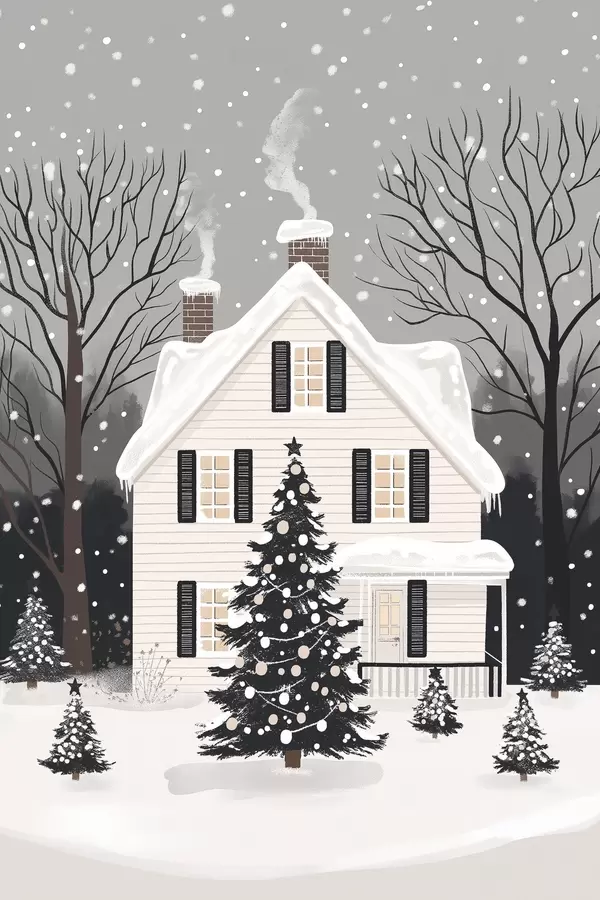 Glezna Ziemas pilsēta, izrotāta priede, Ziemassvētki, mežs, skaista māja s41371