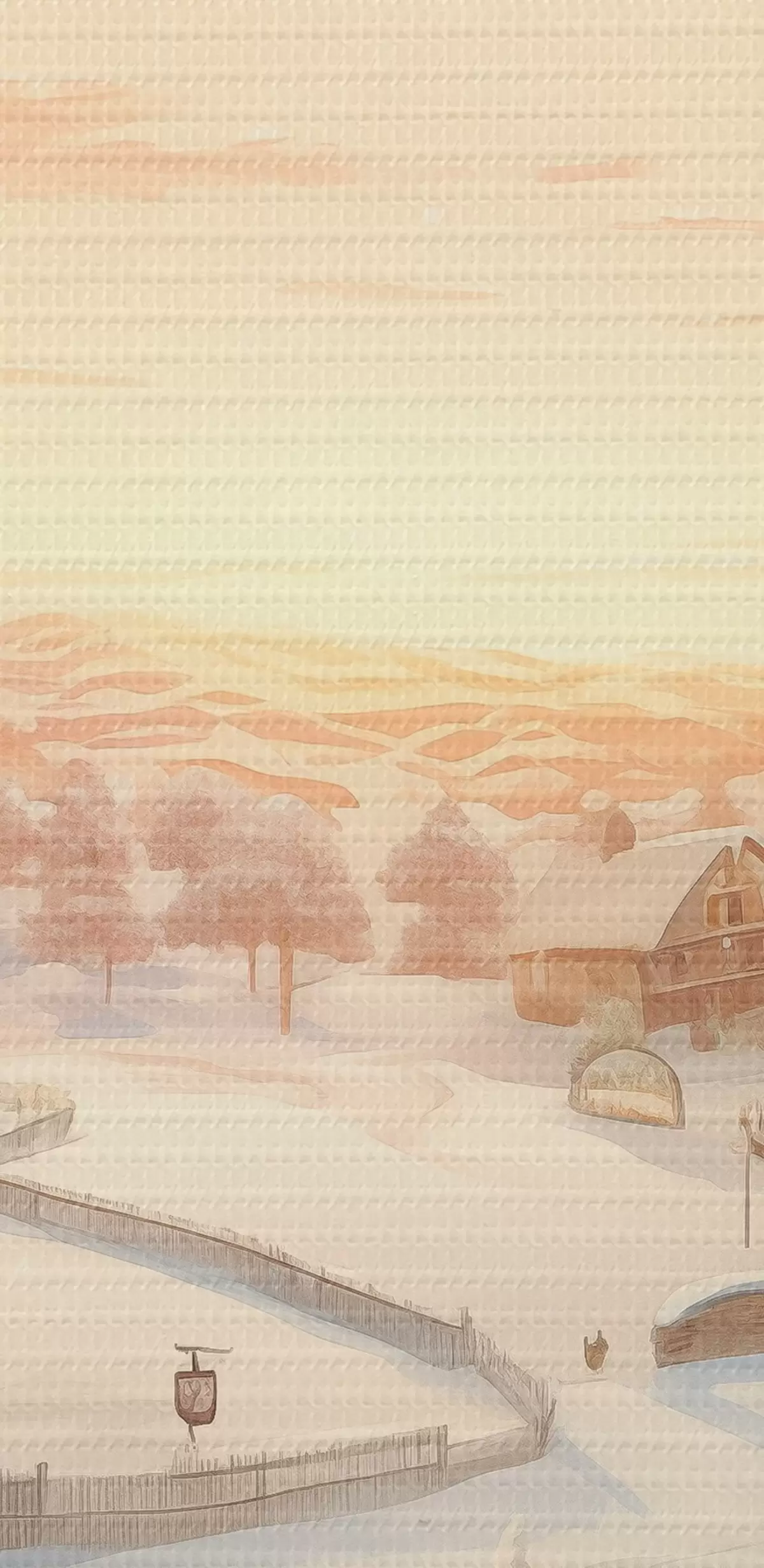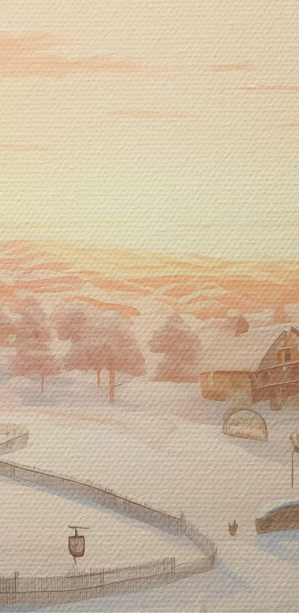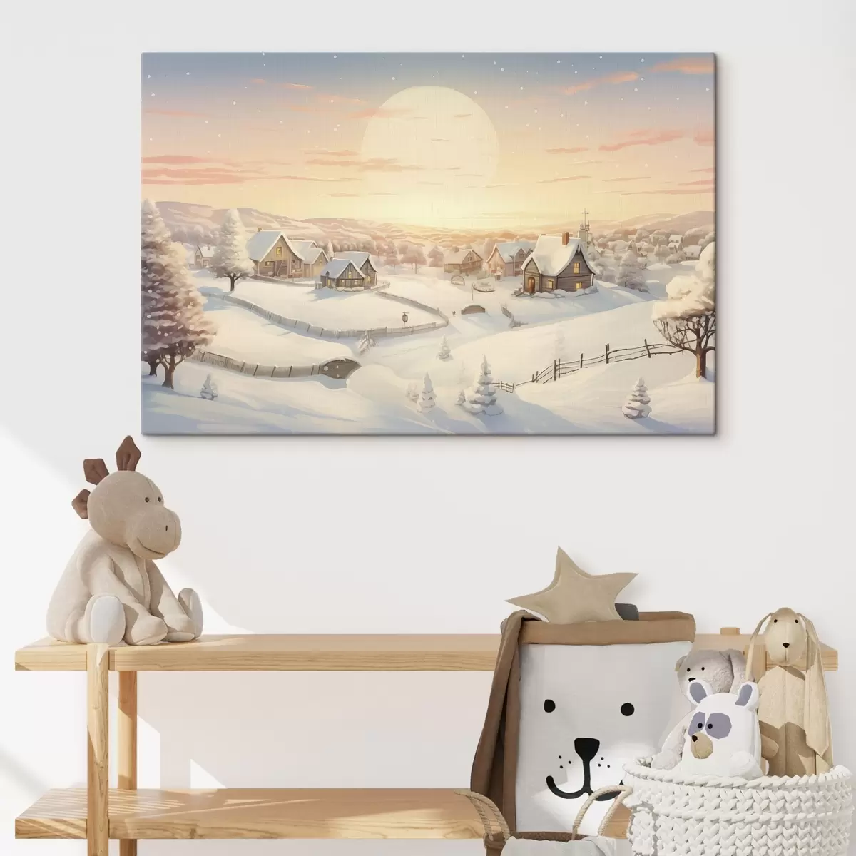 Glezna Ziemas ciemats saulrietā, sniegotas mājas, priedes s41380