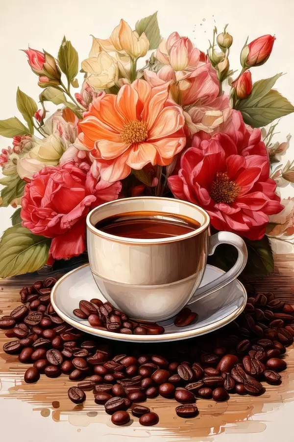 Glezna kafijas tasi un ziedu pušķi Nr s41411
