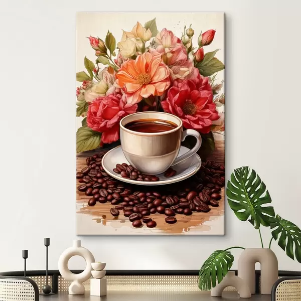 Glezna kafijas tasi un ziedu pušķi Nr s41411