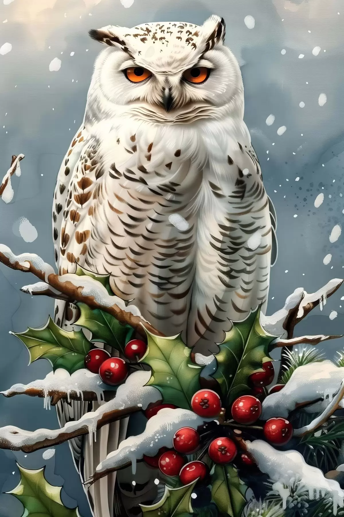 Glezna Pūce uz ziemas zara ar ogām un lapām Nr s41482
