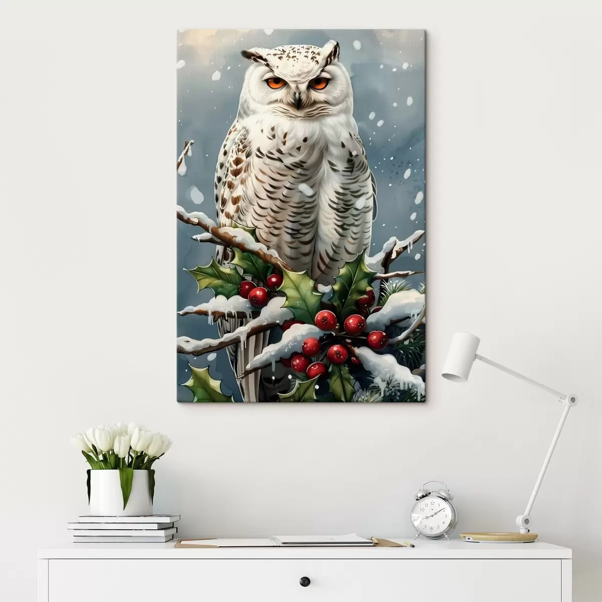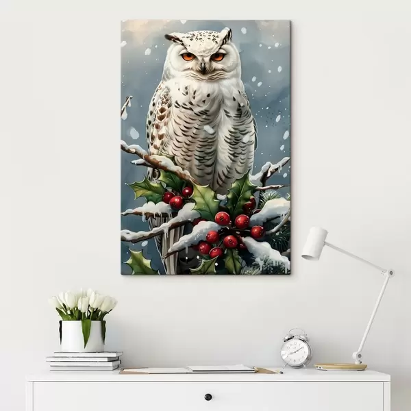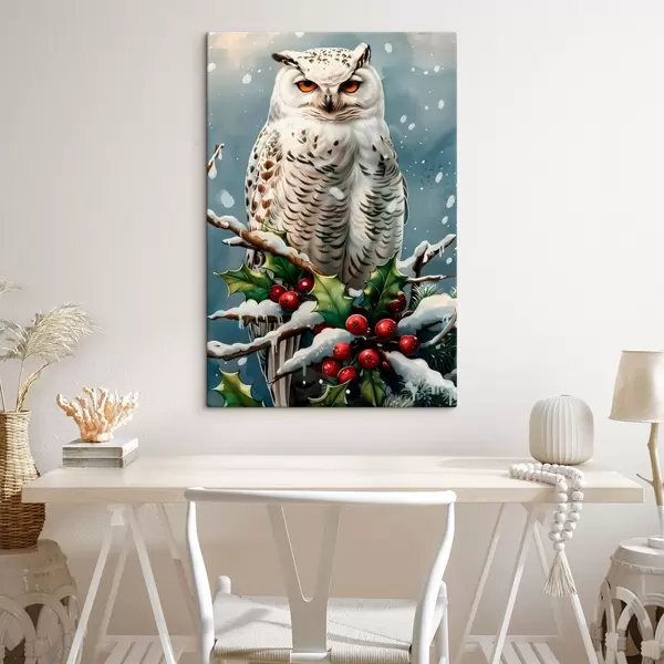 Glezna Pūce uz ziemas zara ar ogām un lapām s41482