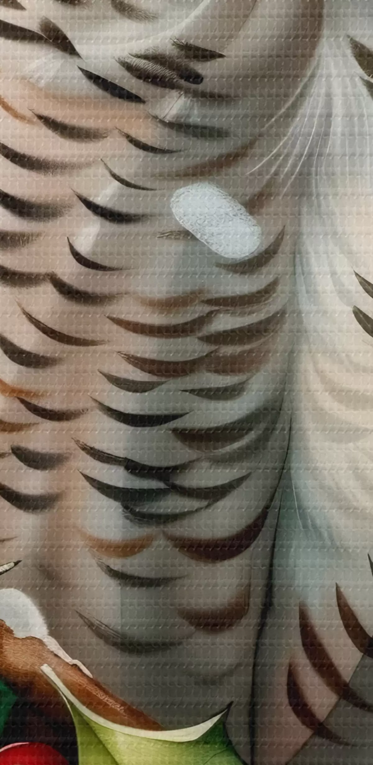 Smalkais diegu pinums uz šī audekla atgādina profesionālu mākslinieku audeklu virsmu.