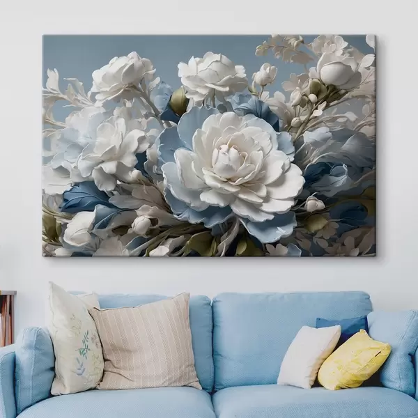 Glezna Balti ziedi un lapas uz zila fona s41527