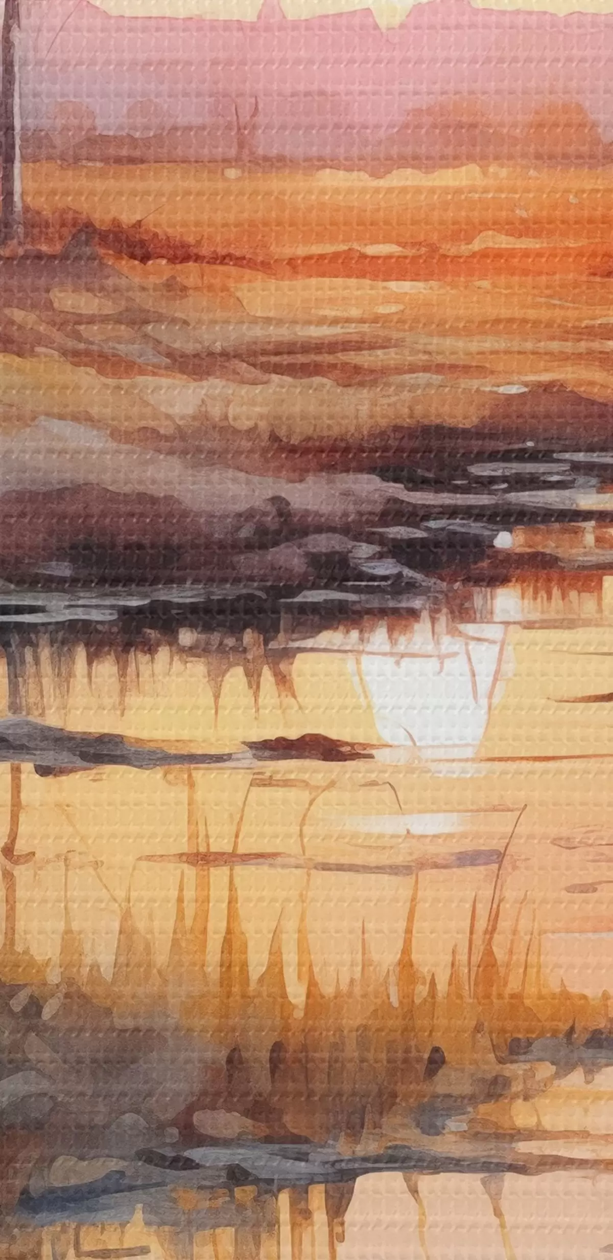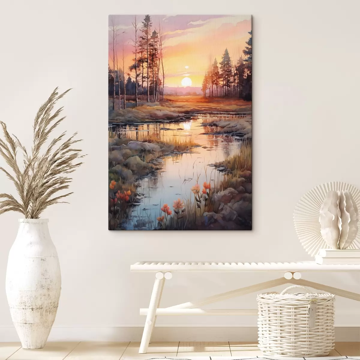 Glezna Skaista upe rudens mežā, akvarelis, pļava, saulrieta debesis s41643
