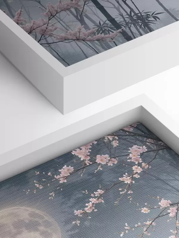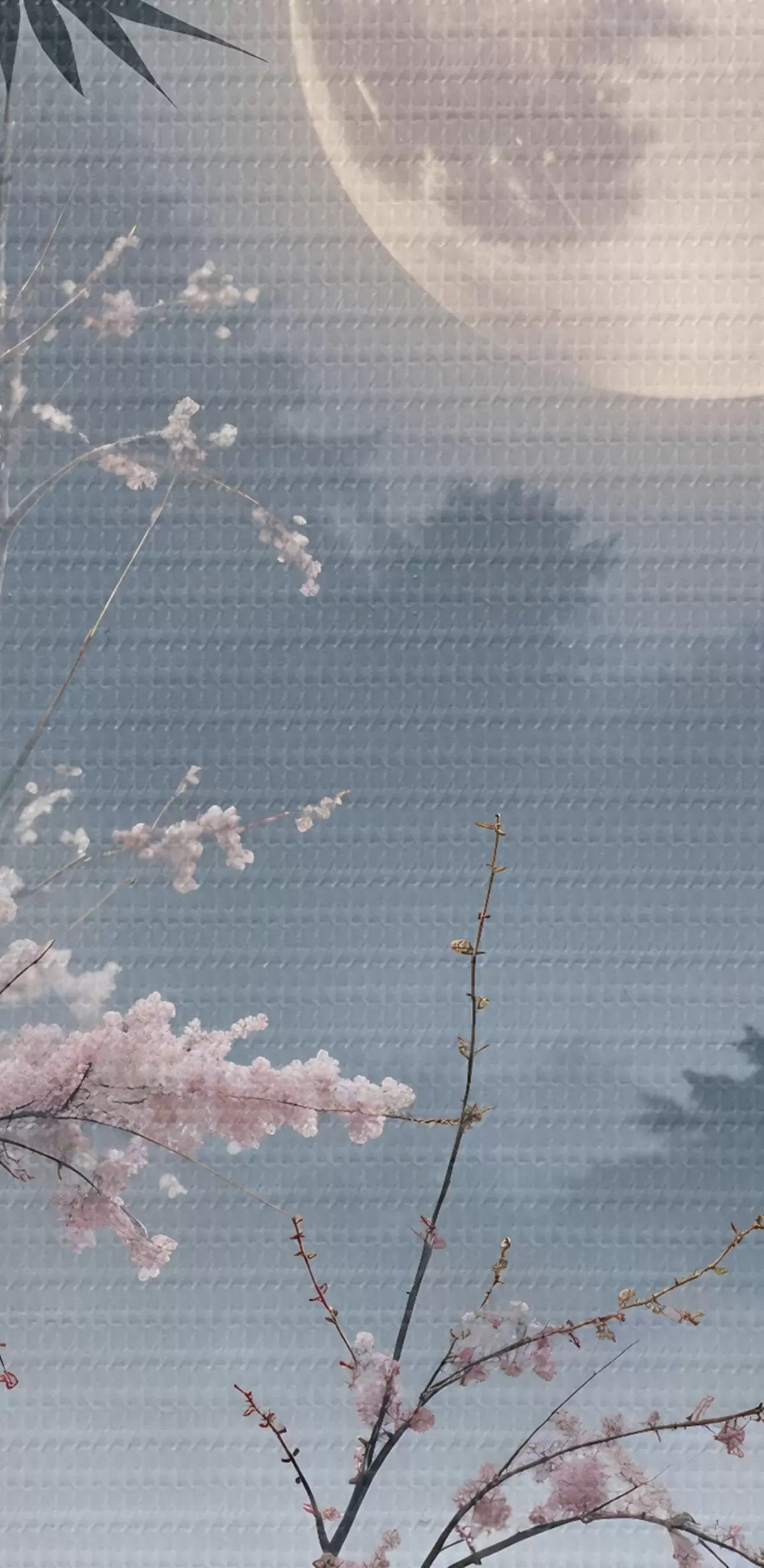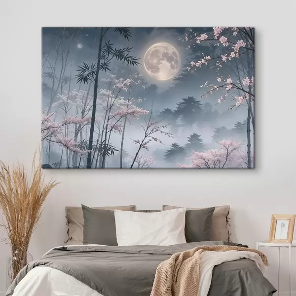Glezna Pilns mēness nakts debesīs, ko ieskauj bambusa koku silueti un ķiršu ziedu zari  s41717
