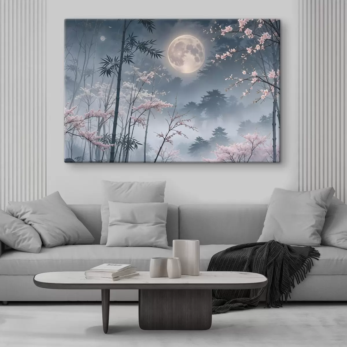 Glezna Pilns mēness nakts debesīs, ko ieskauj bambusa koku silueti un ķiršu ziedu zari Nr s41717