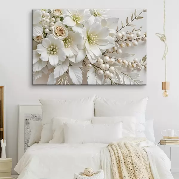 Glezna Smalki balti ziedi, tostarp lilijas, rozes un citi ziedi ar maigām, samtainām ziedlapiņām  s41722