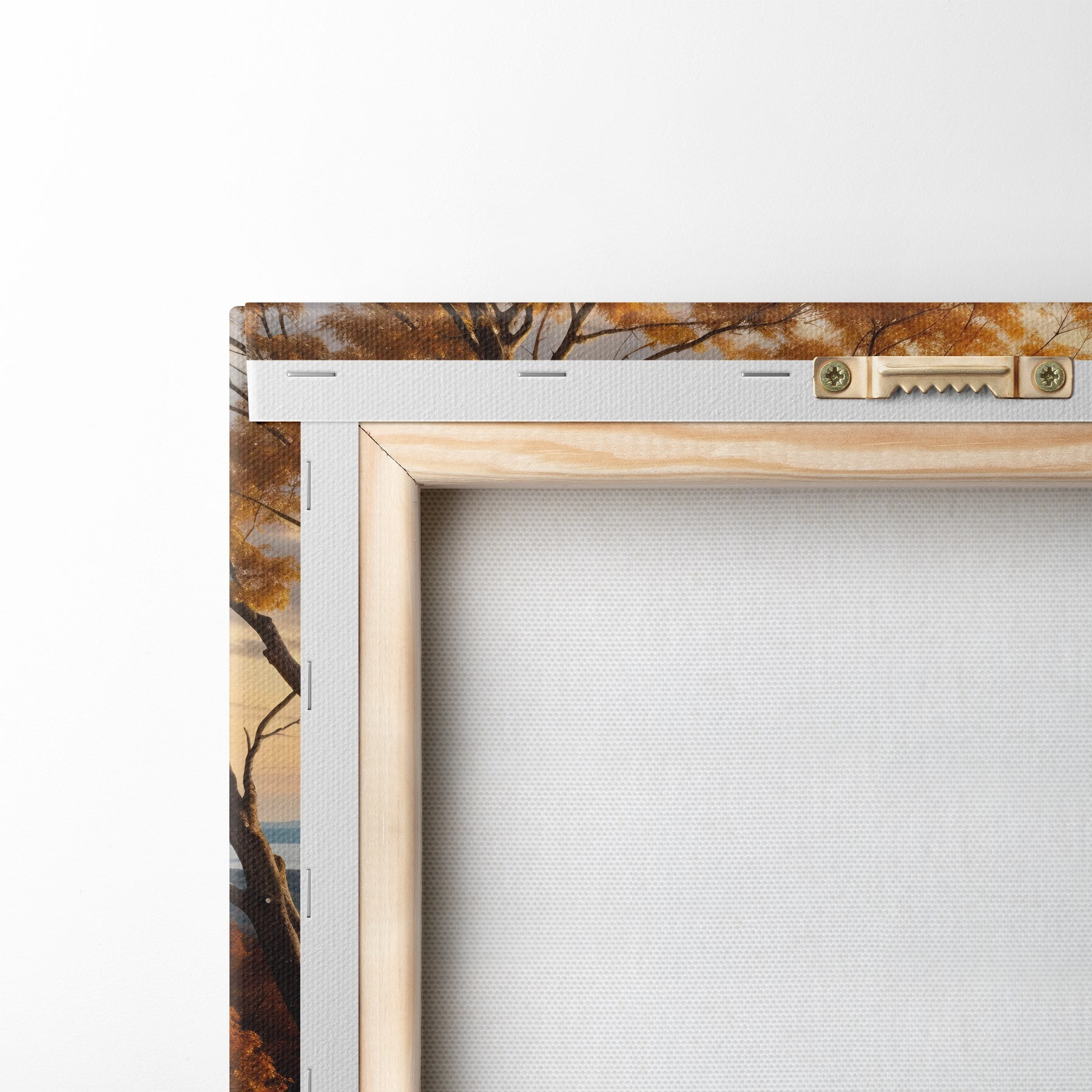 Glezna Ainava ar līkumainu zemes ceļu, kas ved cauri rudenīgi iekrāsotu koku mežam un saulrieta debesīm s41732