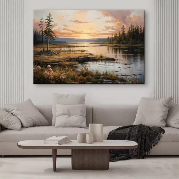 Glezna Mierīga ainava ar priežu ieskautu ezeru, kas atspoguļo saulrieta debesis siltajās krāsās Nr s41733