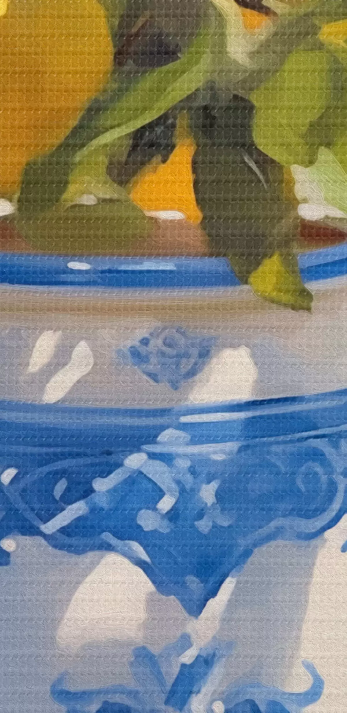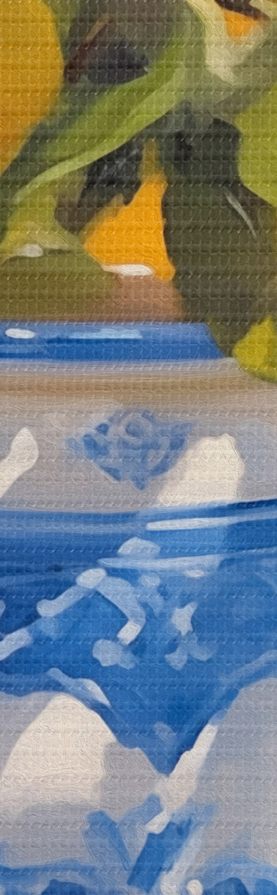Smalkais diegu pinums uz šī audekla atgādina profesionālu mākslinieku audeklu virsmu.