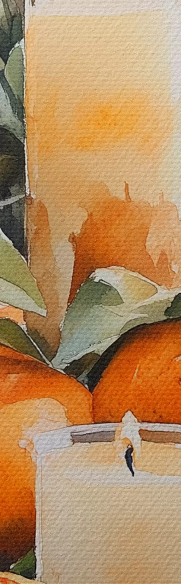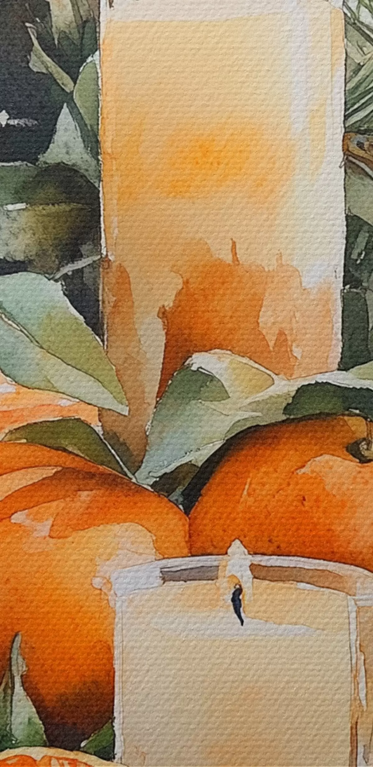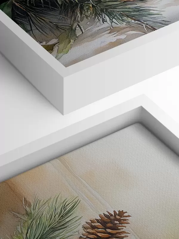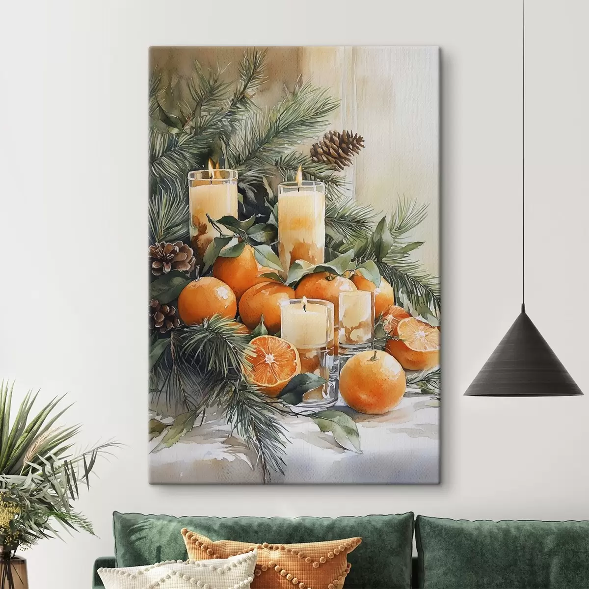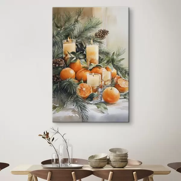 Glezna Priežu zari ar čiekuriem, apelsīniem un svecēm, svētku, akvareļu stilā Nr s41956