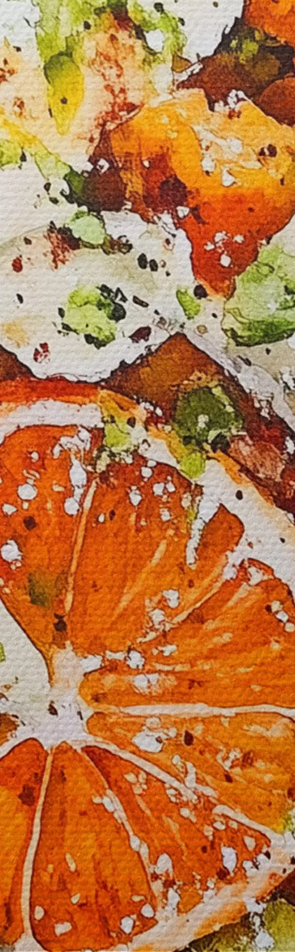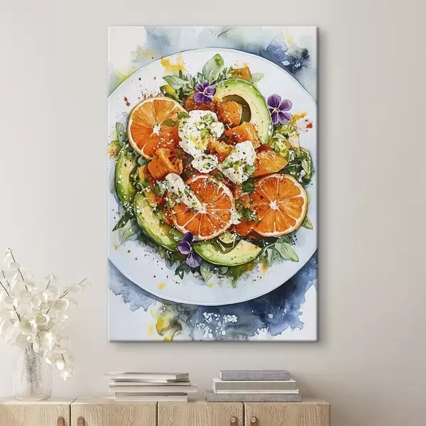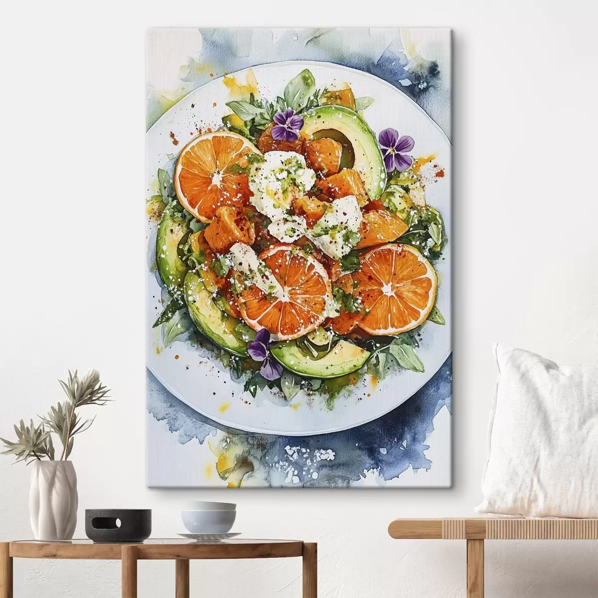 Glezna Garšīgi salāti ar apelsīniem, fetas sieru, ķirbjiem un avokado, akvareļu pārtika s41959