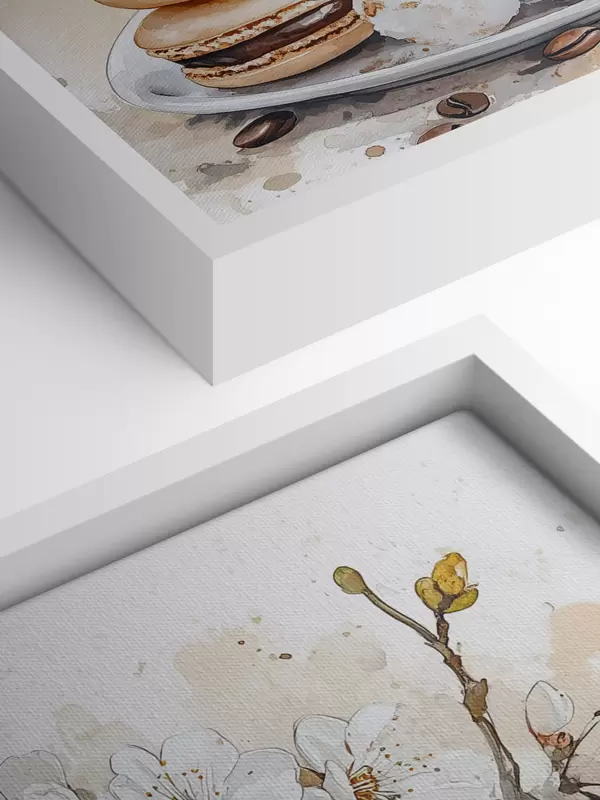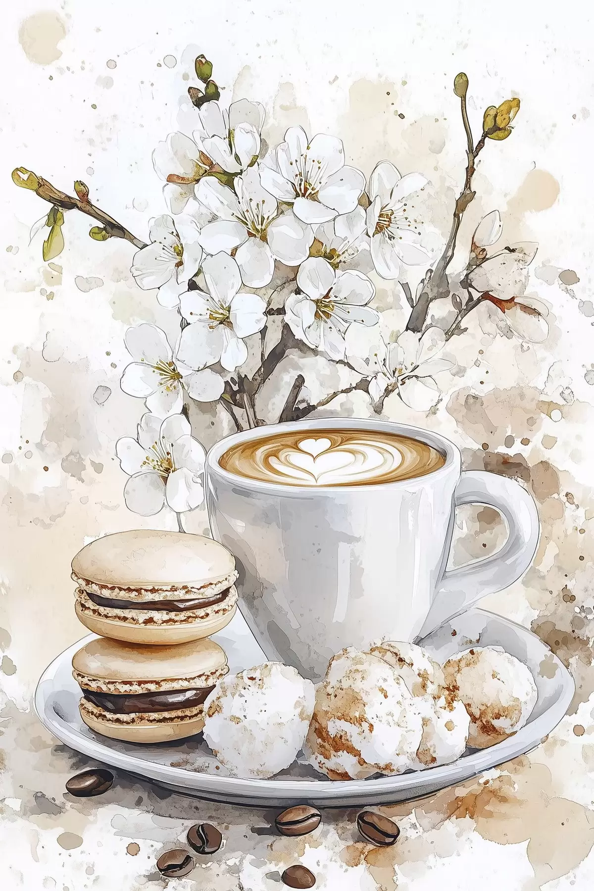 Glezna Skaista kafijas tasīte, jasmīna ziedi, makaroni, maigas akvareļu krāsas s41964