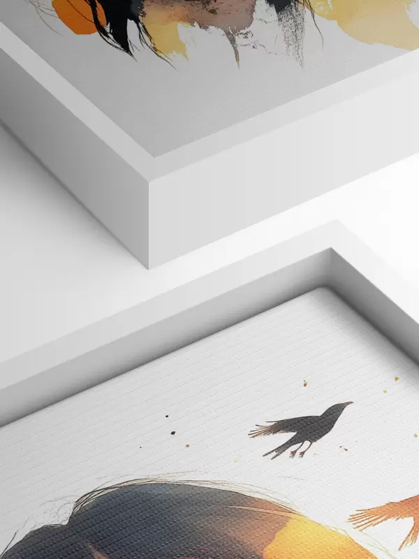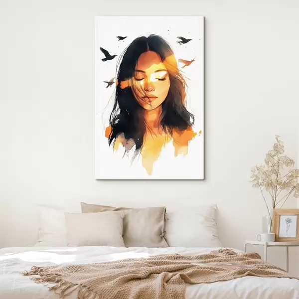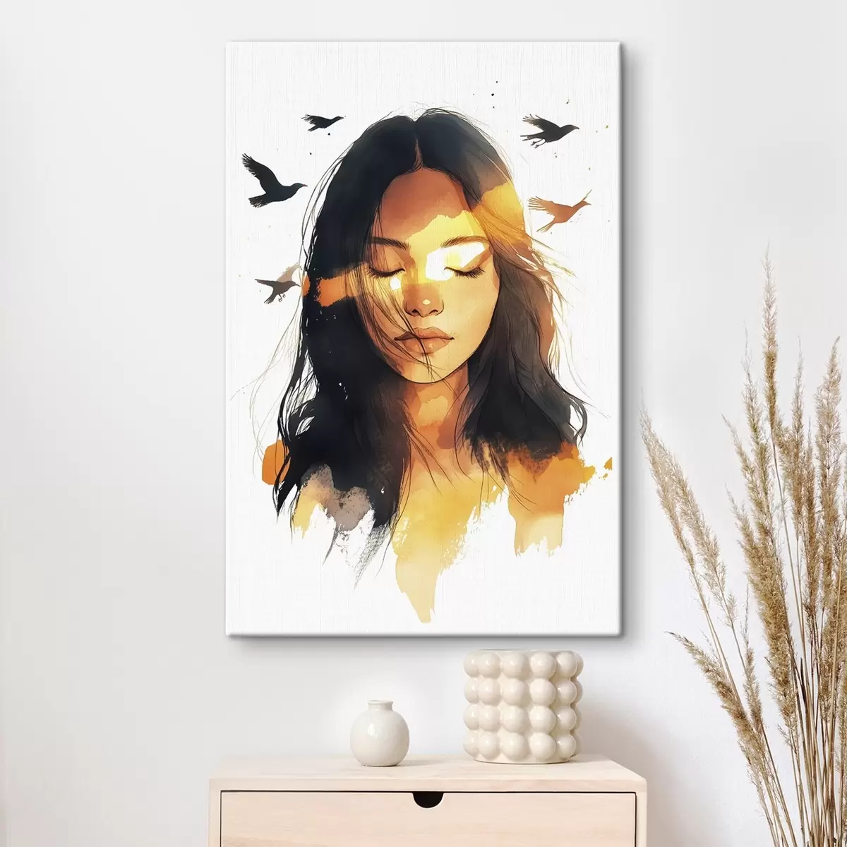 Glezna Akvareļu stila portrets, skaista meitene, saules gaisma, lidojoši putni s42198