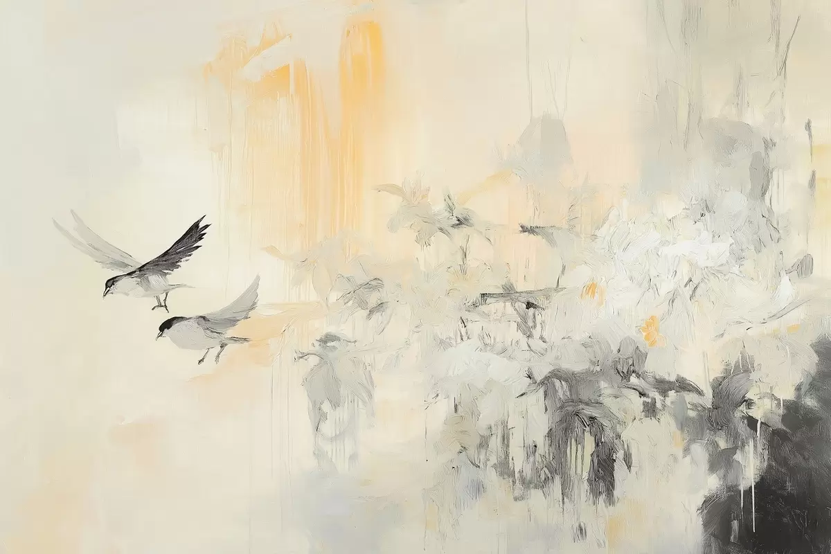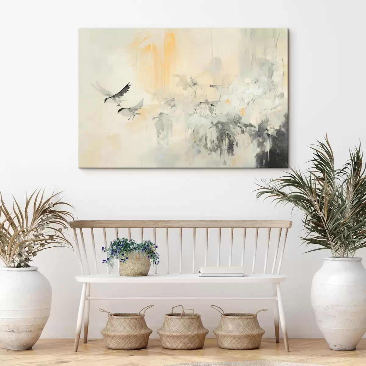Glezna Abstrakcija ar putniem, akrila stilā, pelēkā un bēšā krāsā Nr s42206