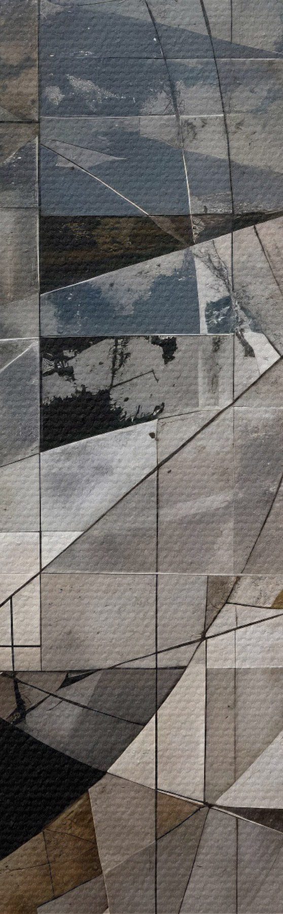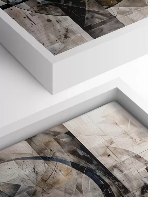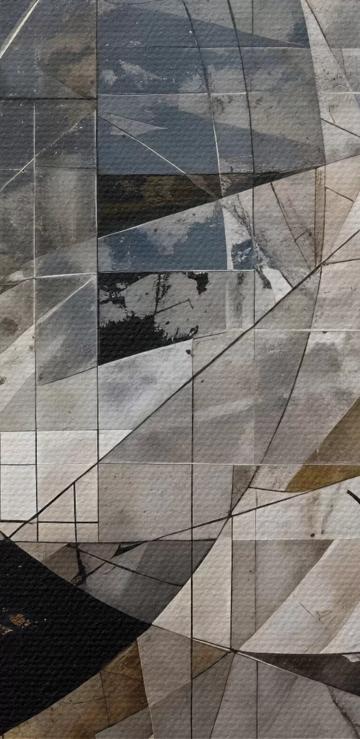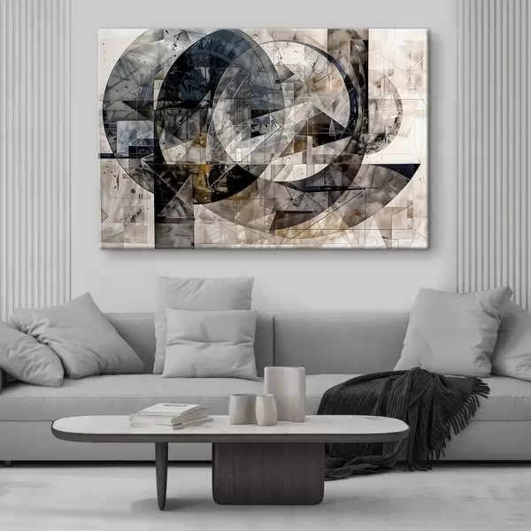 Glezna Abstrakta moderna ģeometriska kompozīcija ar pārklājošām formām un apdruku pelēkos, melnos un bēšos toņos s42212