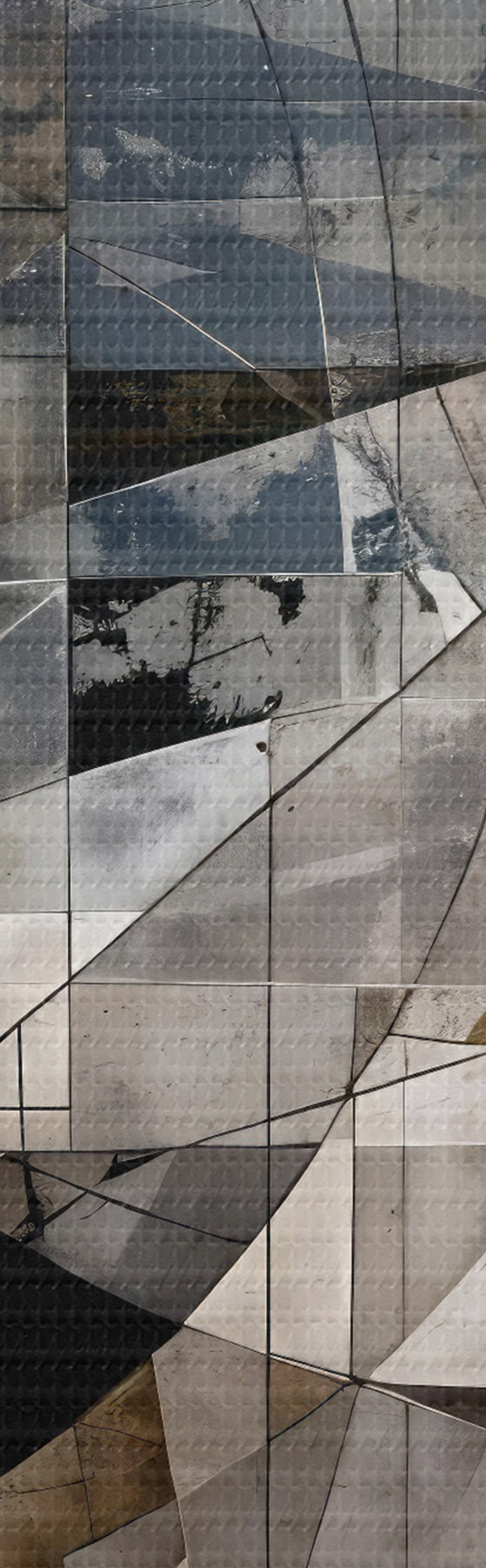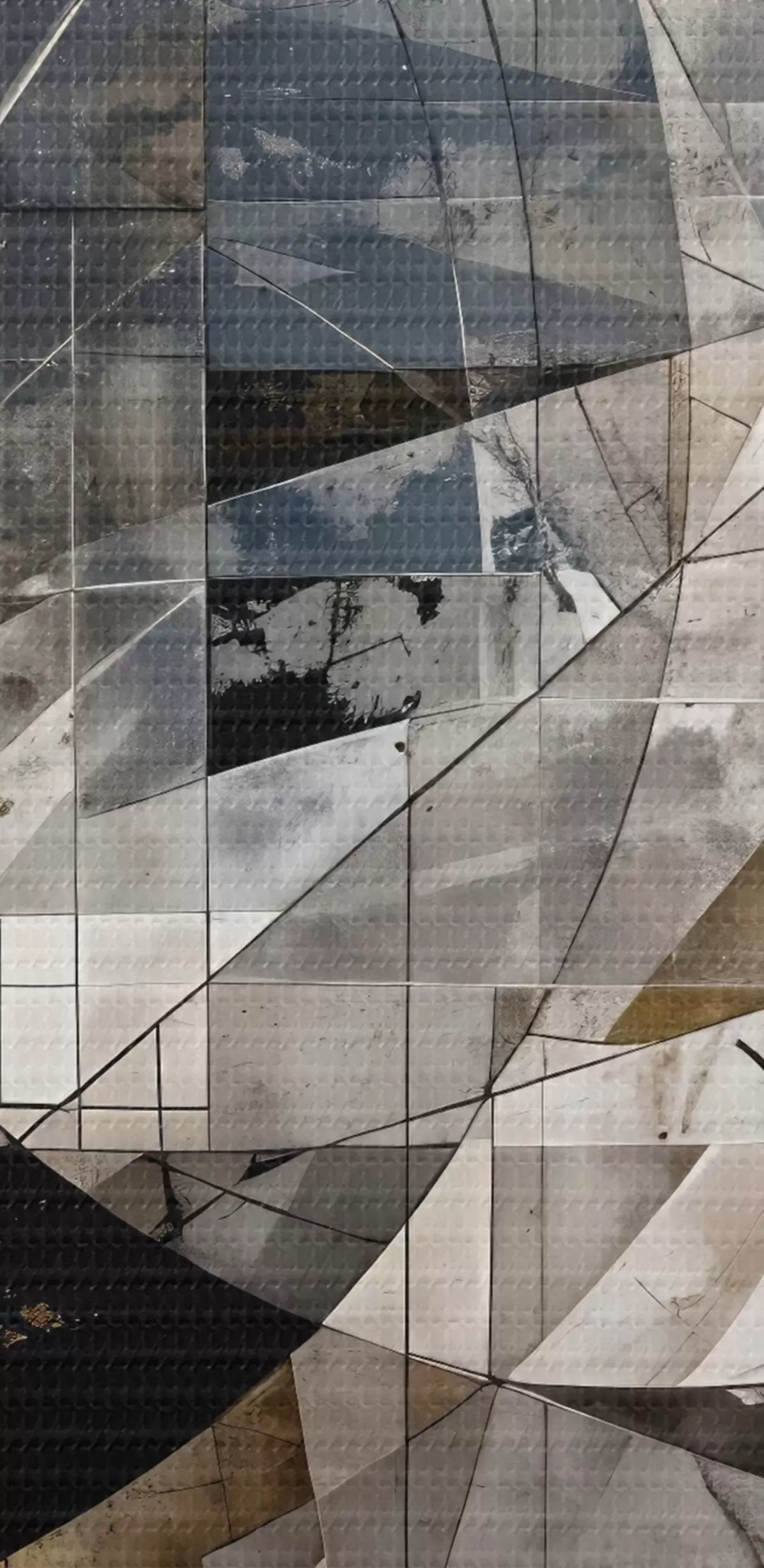 Glezna Abstrakta moderna ģeometriska kompozīcija ar pārklājošām formām un apdruku pelēkos, melnos un bēšos toņos Nr s42212