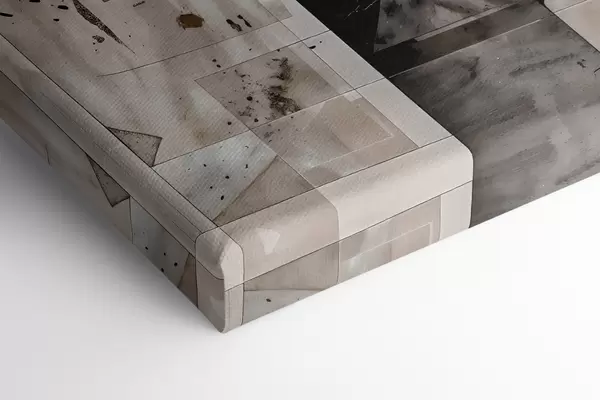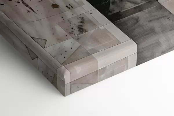 Glezna Abstrakta moderna ģeometriska kompozīcija ar pārklājošām formām un apdruku pelēkos, melnos un bēšos toņos s42212