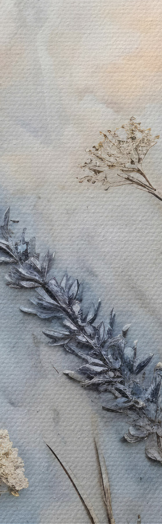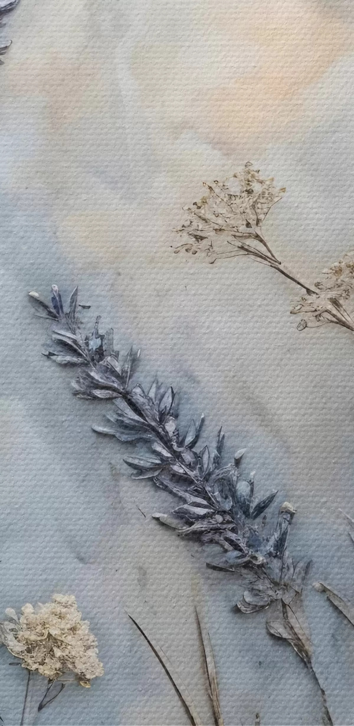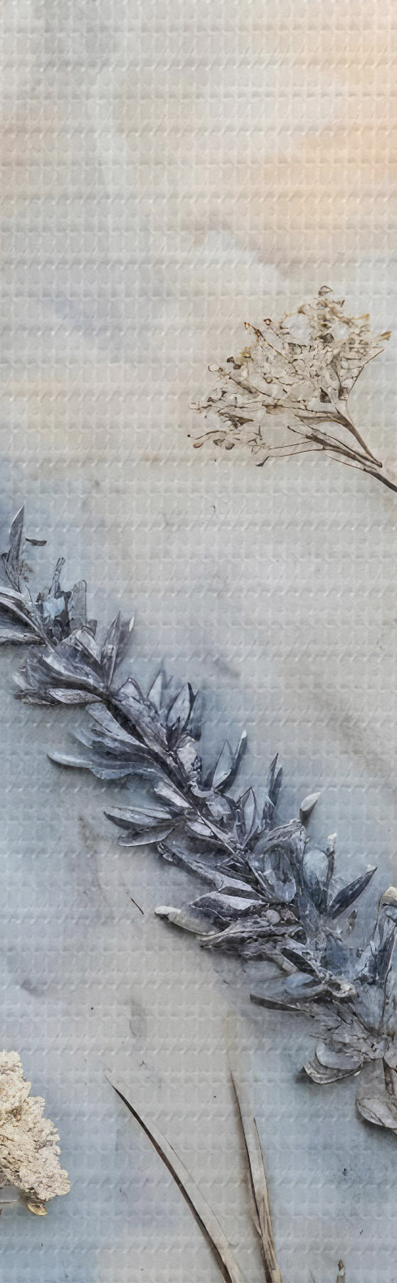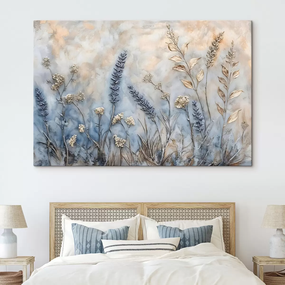 Glezna Dažādu savvaļas ziedu un augu lauks zilos, baltos un smilškrāsas toņos uz maiga, miglaina fona Nr s42214