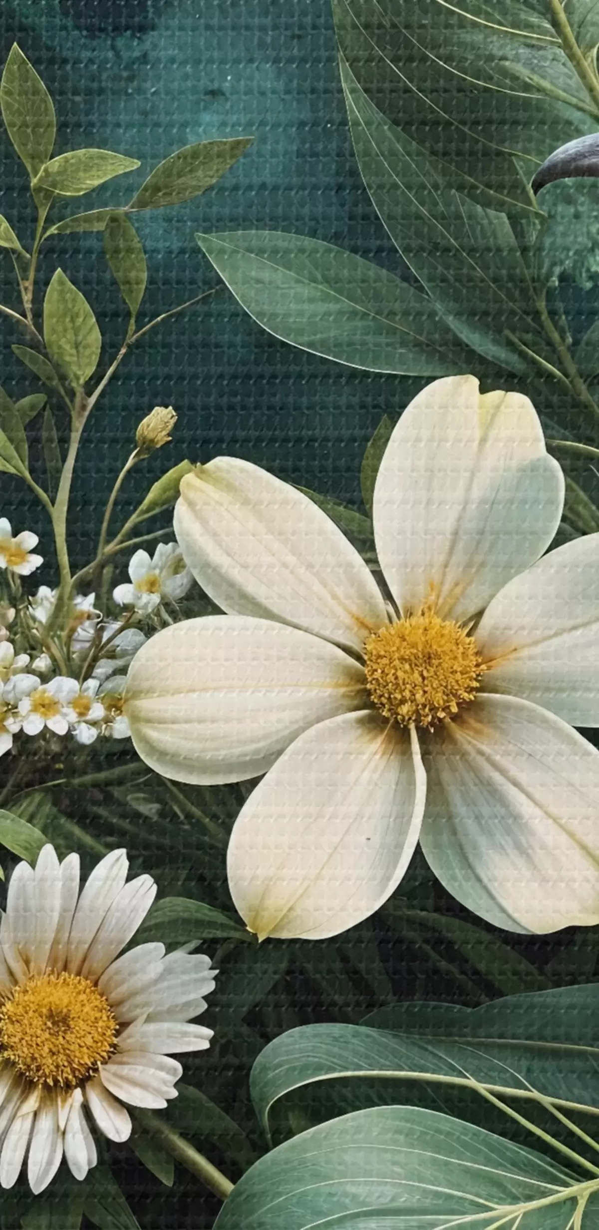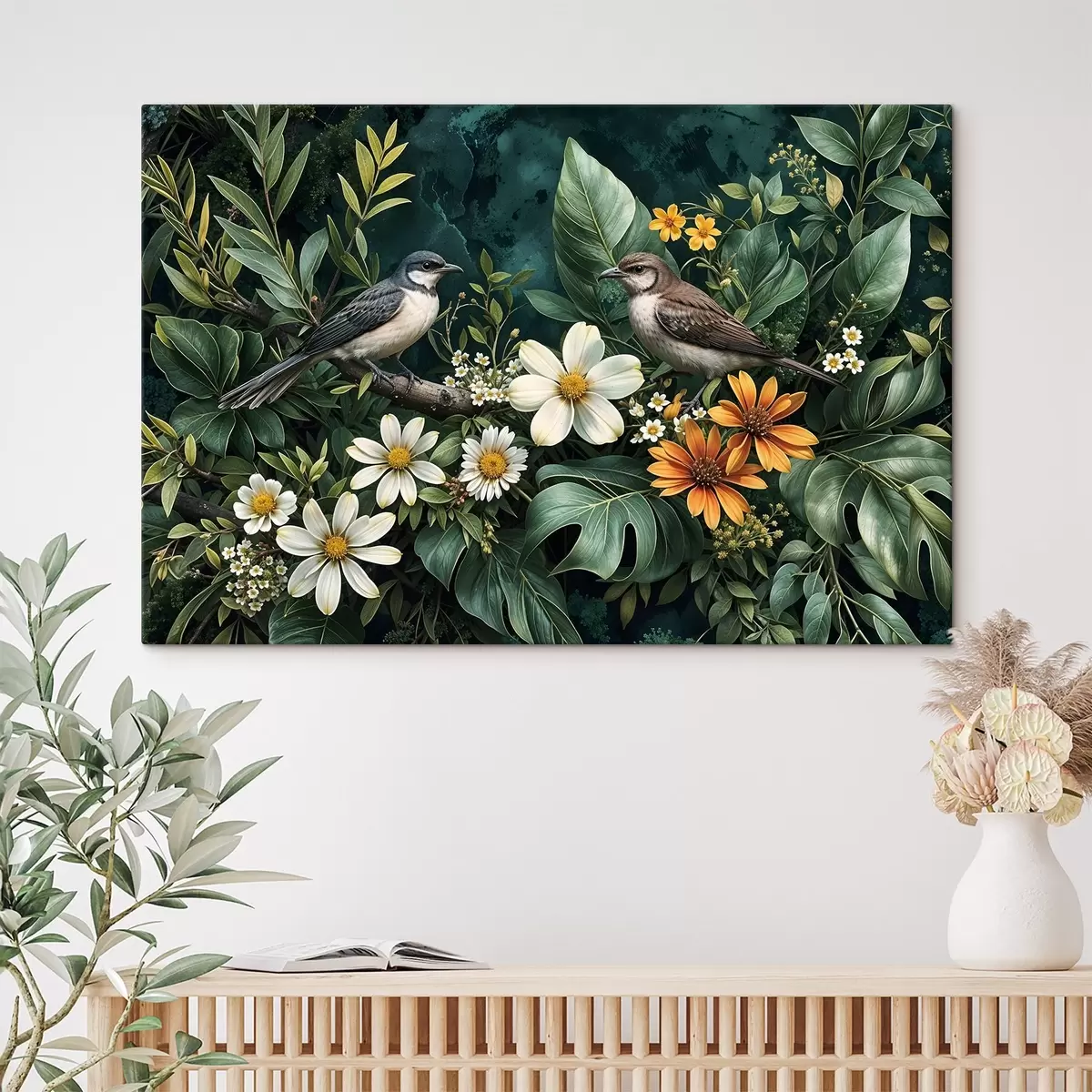 Glezna Nelieli putni, kas sēž uz zariem, ko ieskauj sulīga tropu lapotne, tostarp lielas zaļas lapas un krāsaini ziedi Nr s42220
