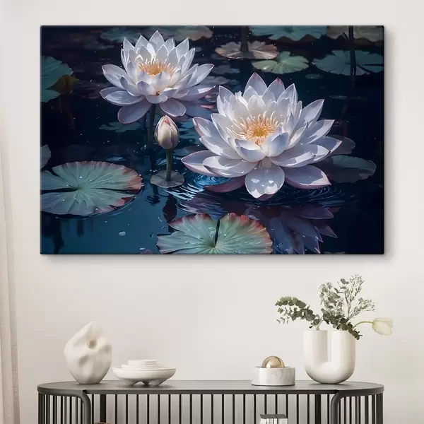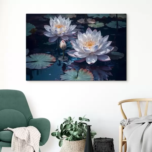 Glezna Balti lotosa ziedi peld uz klusa dīķa ar liliju spilventiņiem s42225