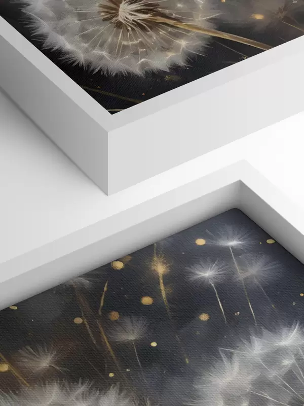 Glezna Pūkainie pieneņu ziedi ar pūkainām baltām sēklu galviņām uz tumša fona, radot burvīgu atmosfēru s42235