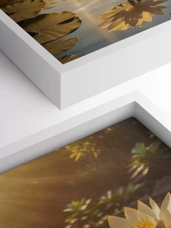 Glezna Balti lotosa ziedi, kas peld uz mierīga dīķa, saulei spīdot, radot mierīgu un klusu atmosfēru s42239