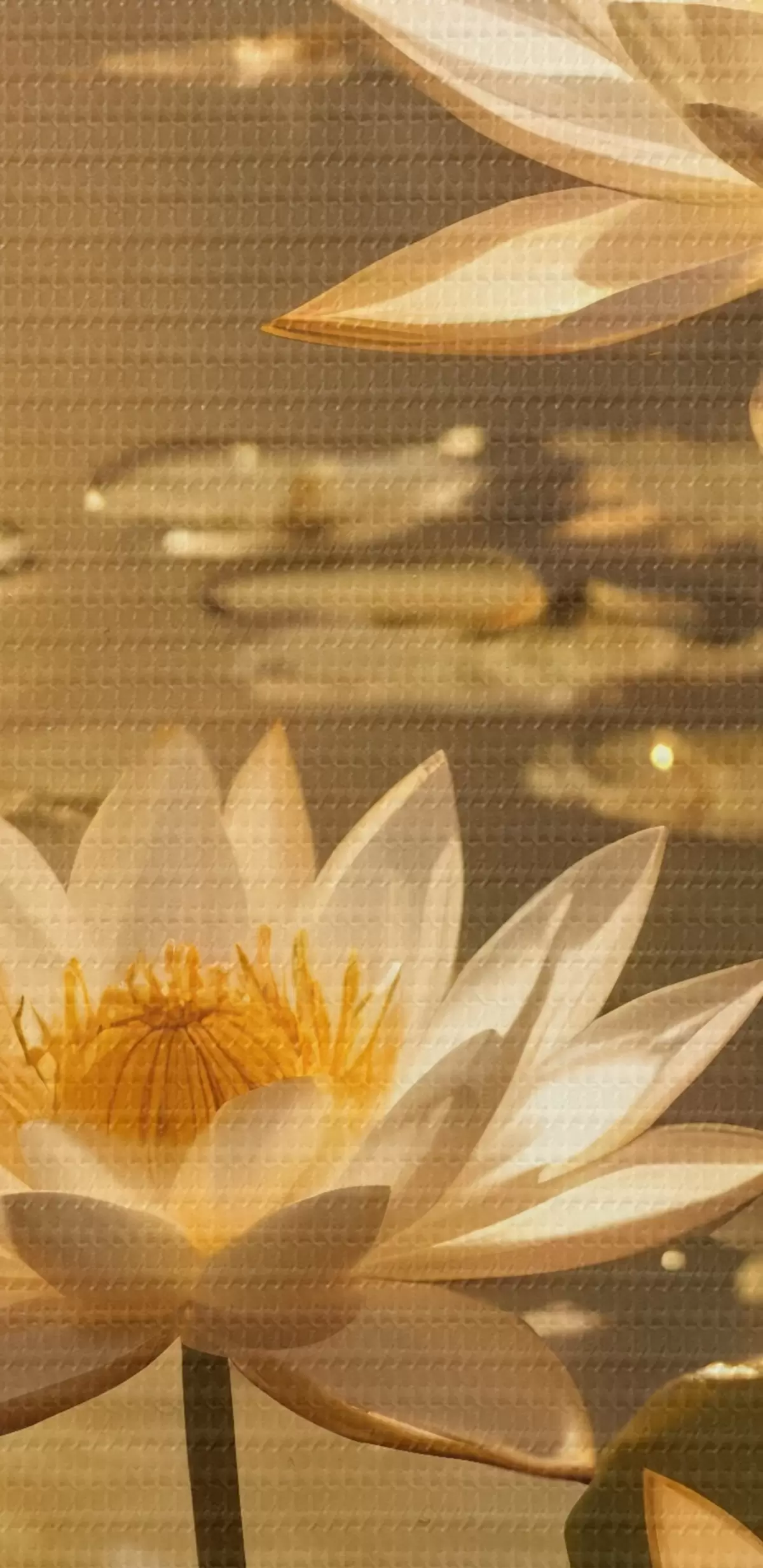 Glezna Balti lotosa ziedi, kas peld uz mierīga dīķa, saulei spīdot, radot mierīgu un klusu atmosfēru Nr s42239