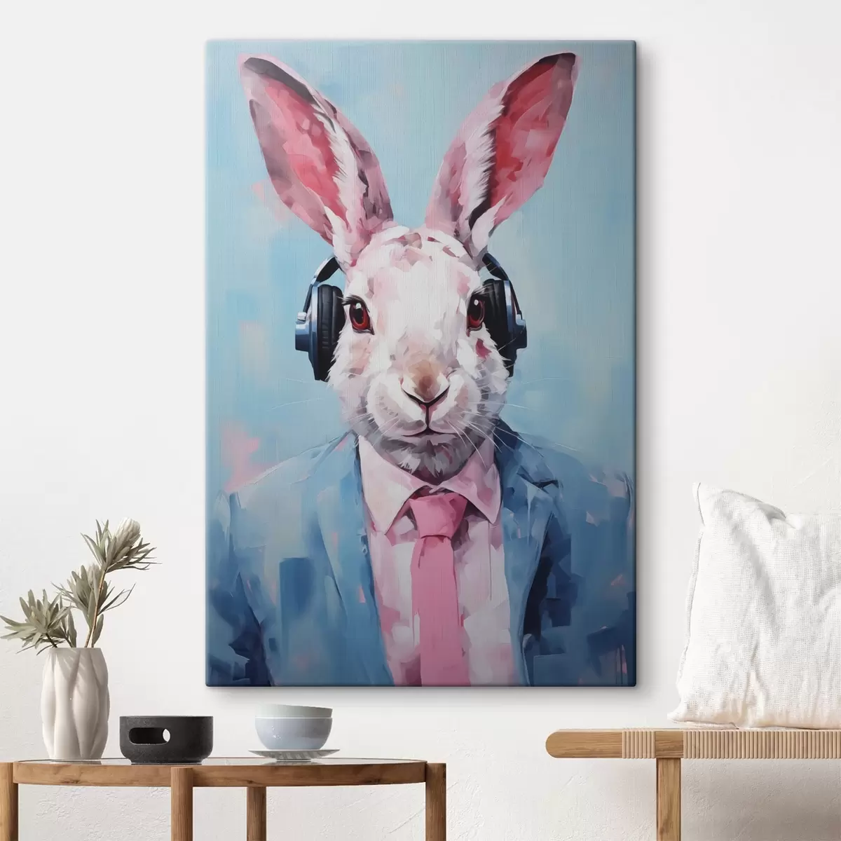 Glezna Trusis ar austiņām zilā žaketē, kas imitē glezniecību s42365