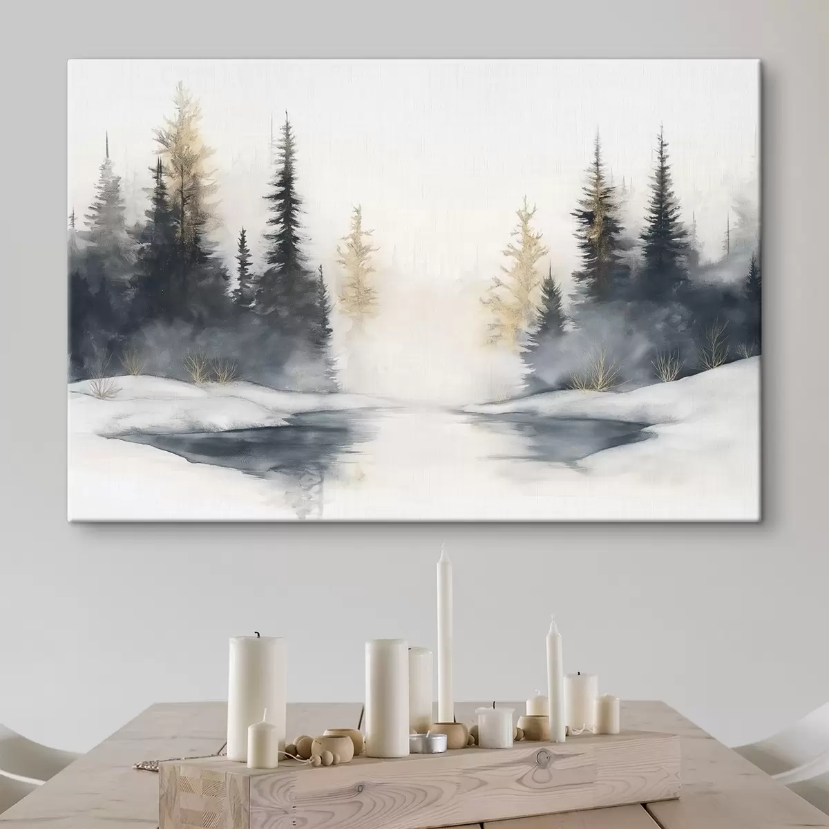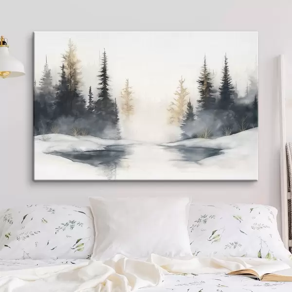 Glezna Ziemas ainava ar upi un priedēm, daba, mežs, migla Nr s42374