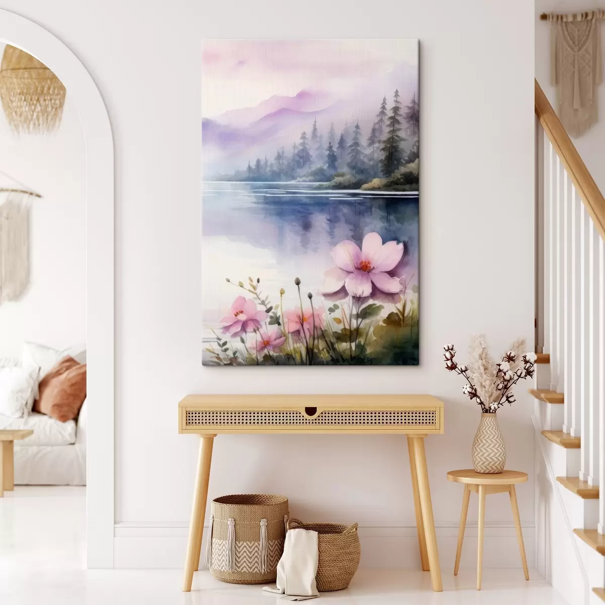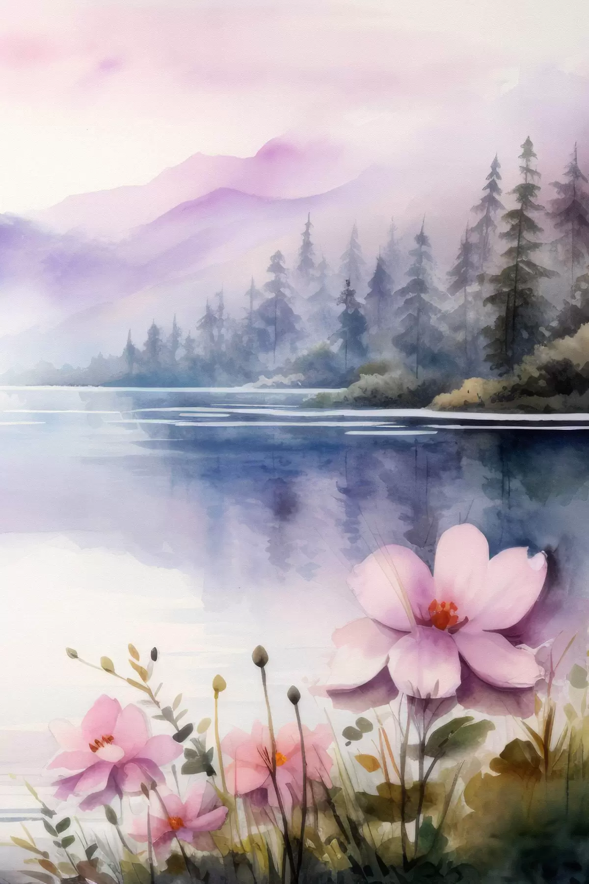 Glezna Rozā ziedi uz ezera fona kalnos Nr s42393
