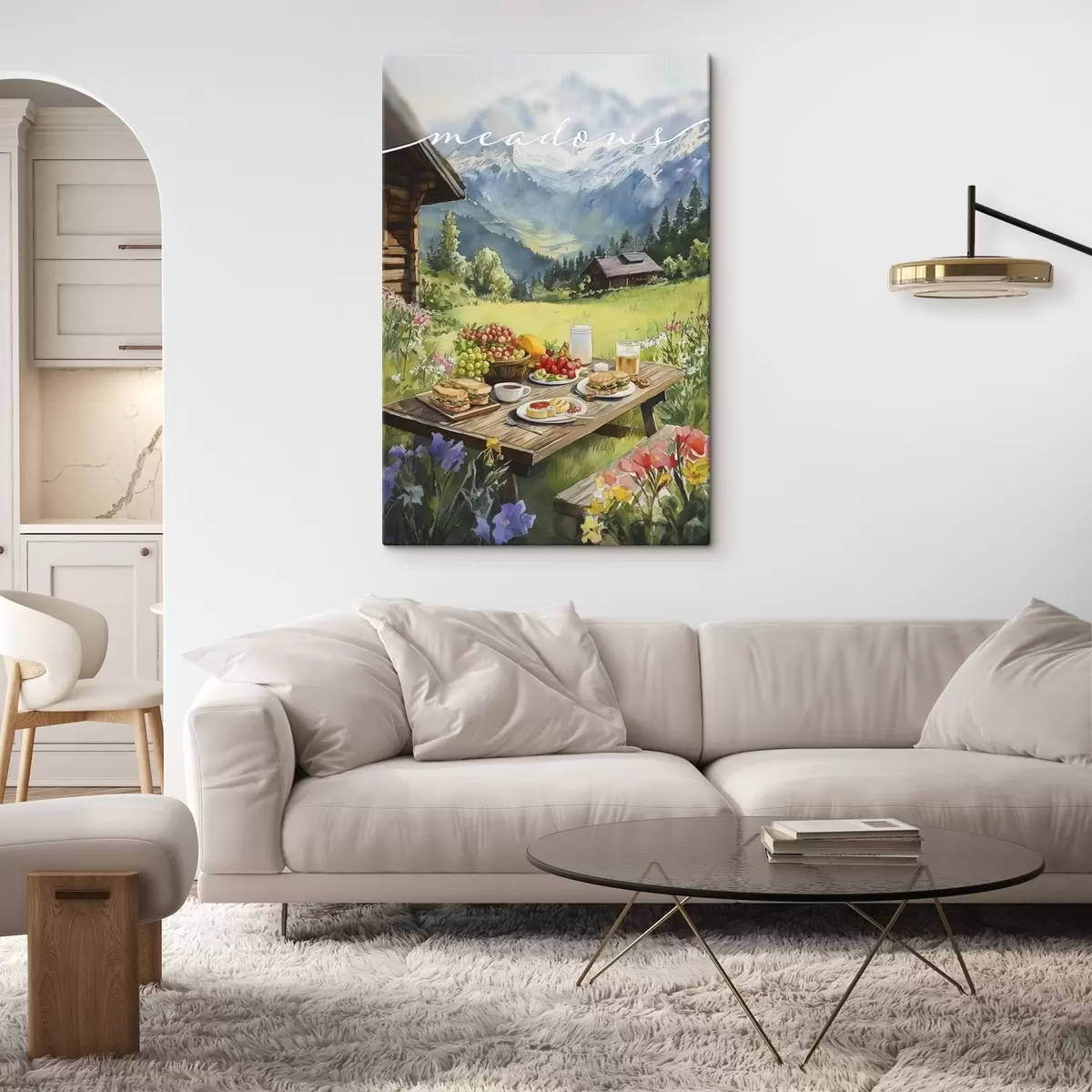 Glezna Kalnu ainavas, vasaras pļava, koka mājas, brokastis s42425
