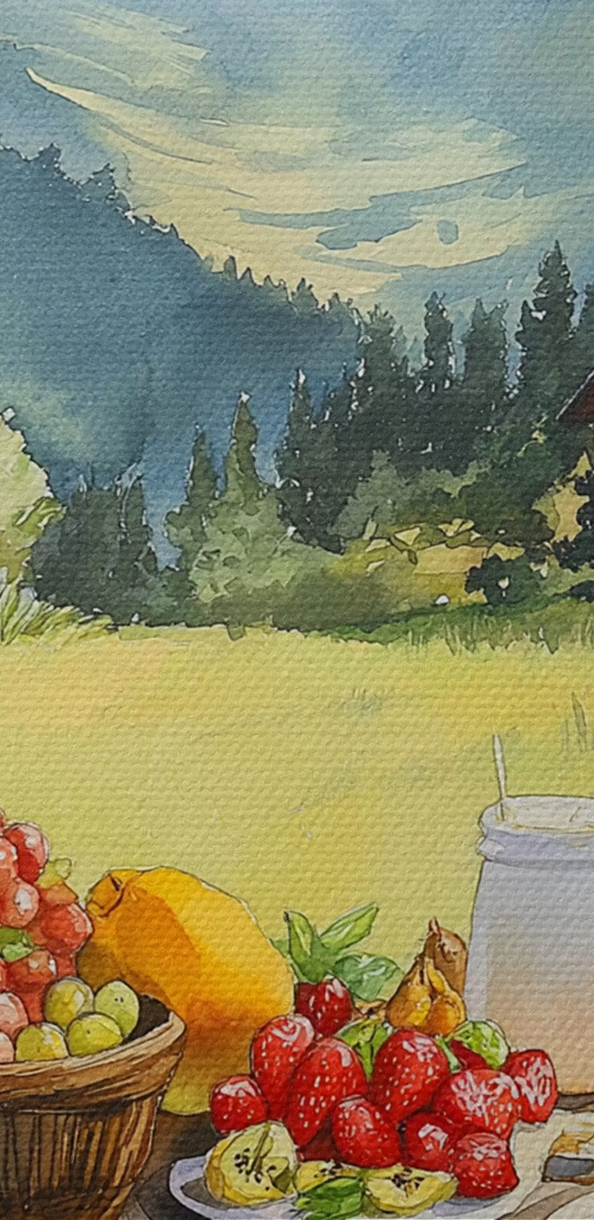 Glezna Kalnu ainavas, vasaras pļava, koka mājas, brokastis Nr s42425